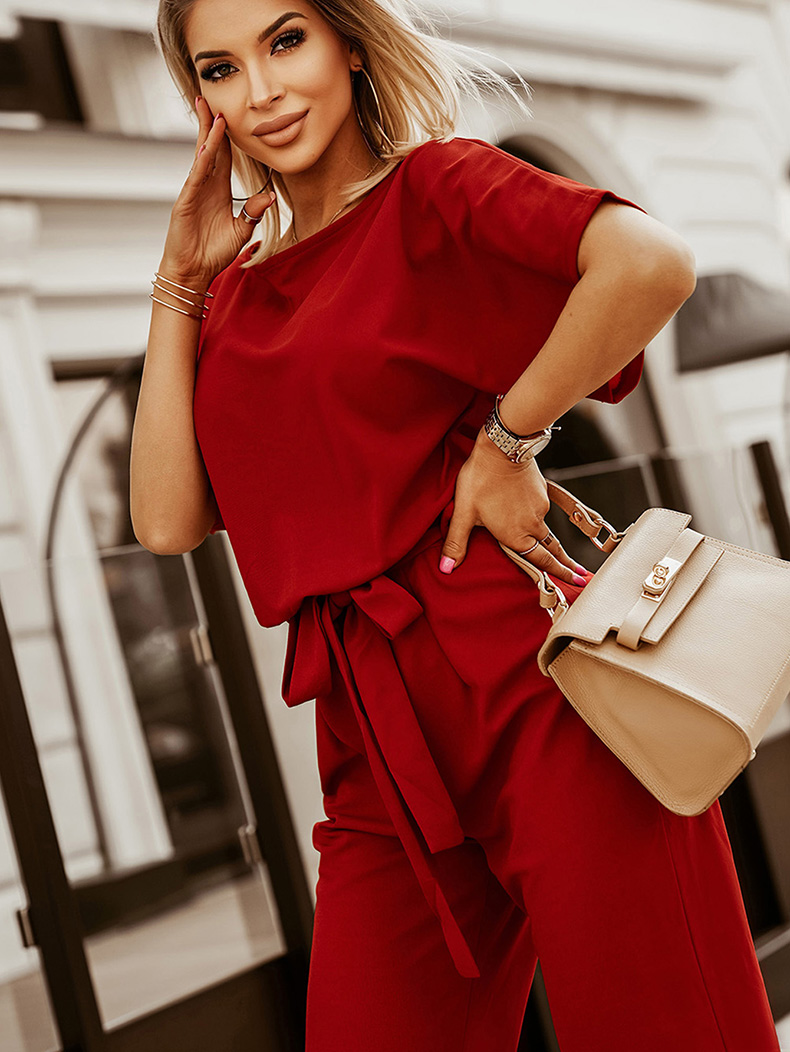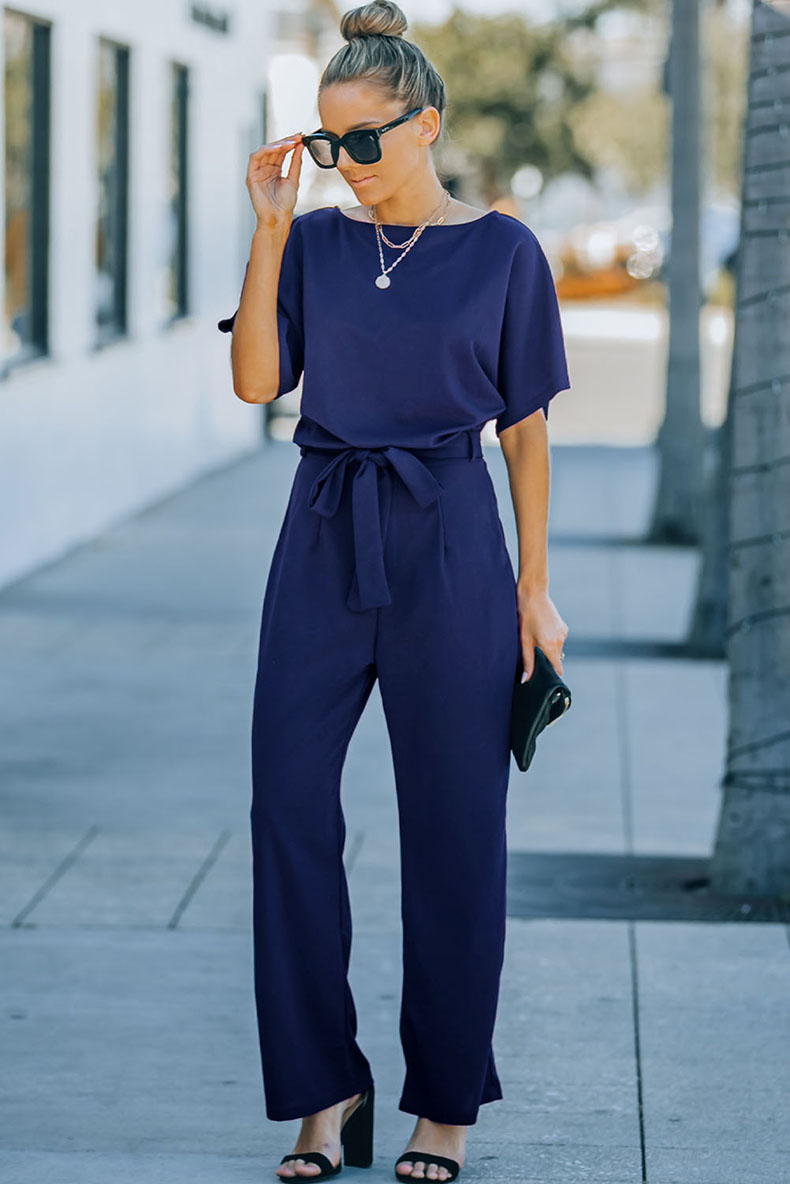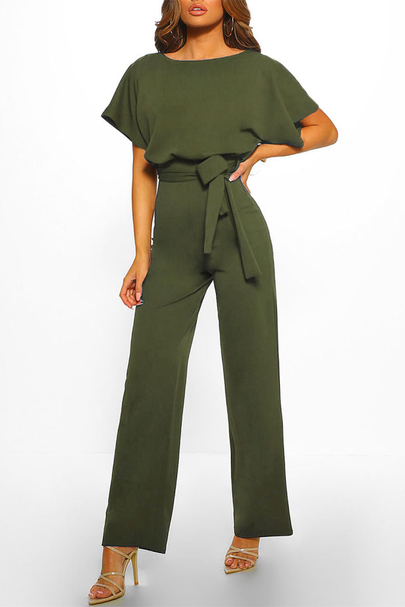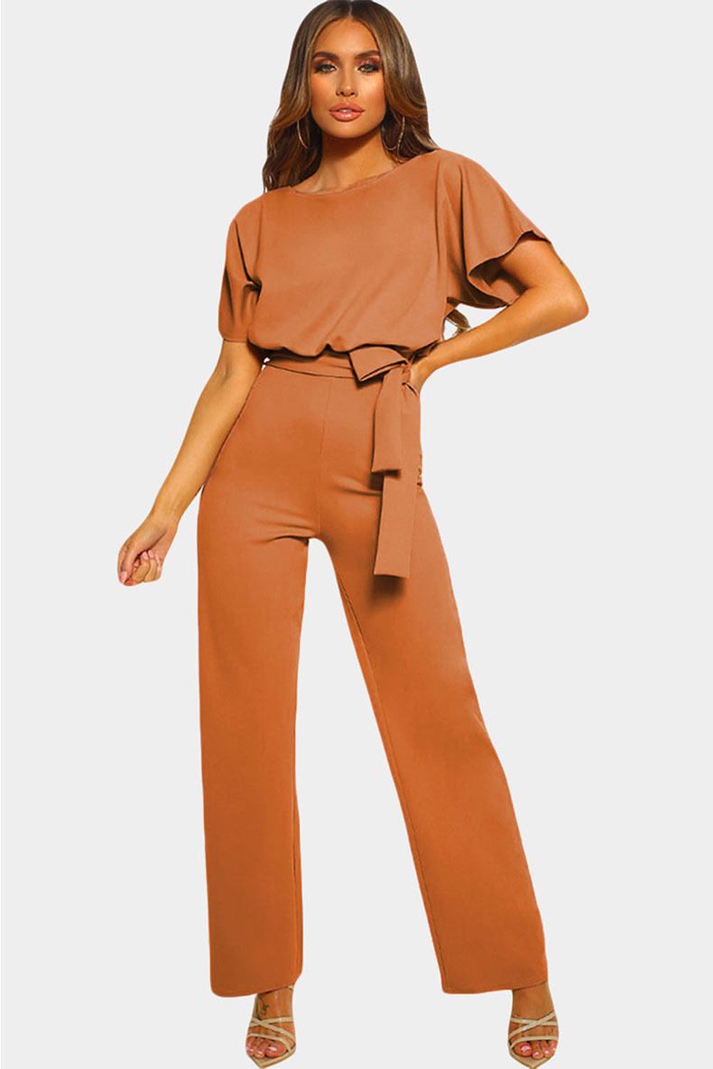 2025夏季薄款純色短袖連體衣女歐美個性系腰帶後背鏤空濶腿連體褲