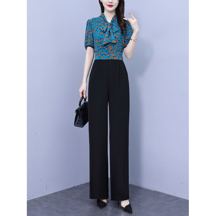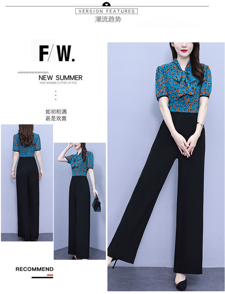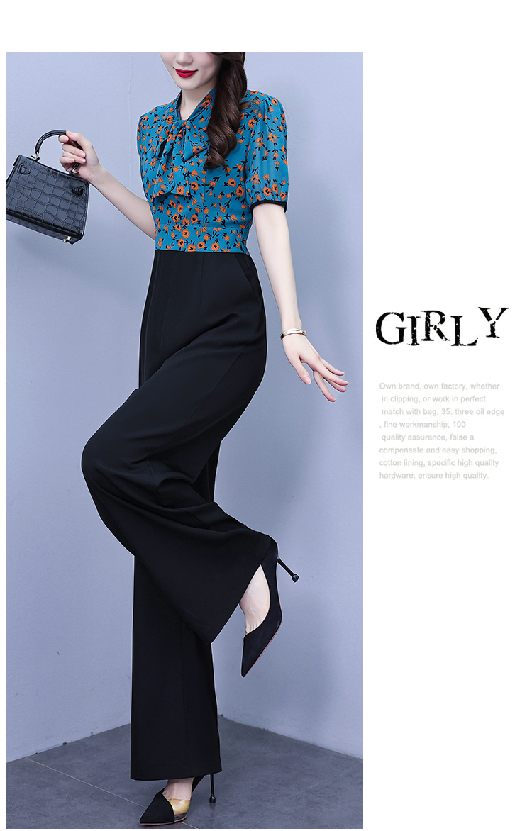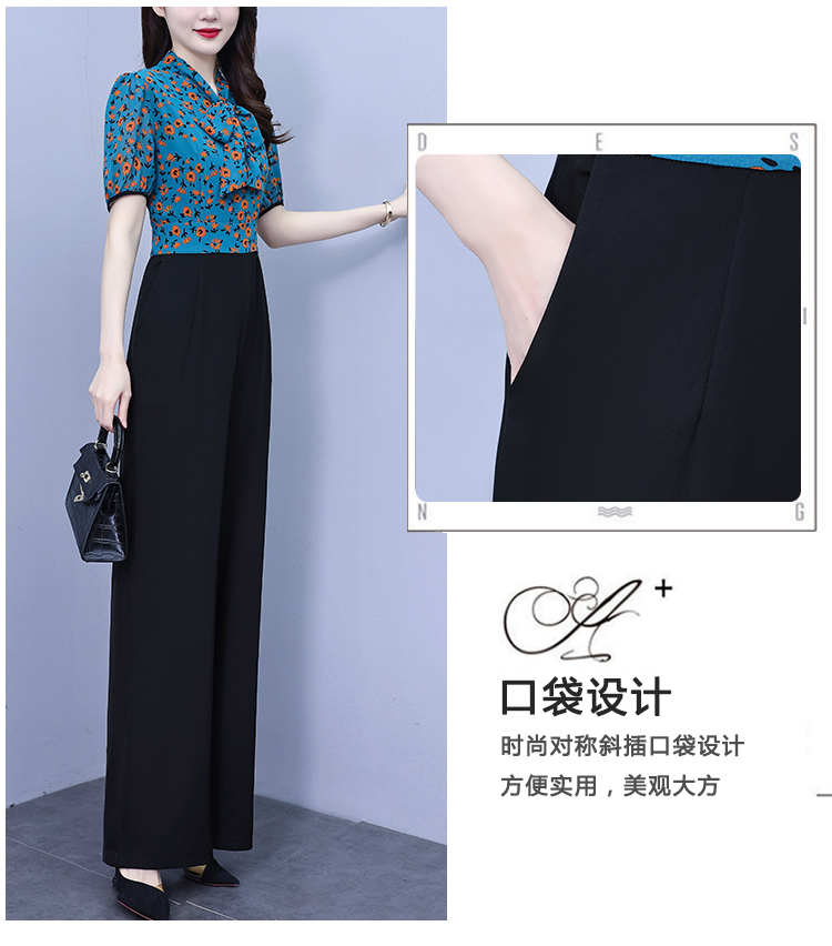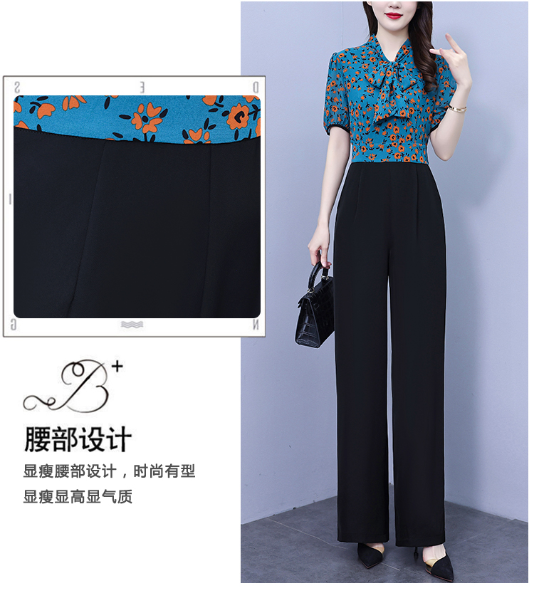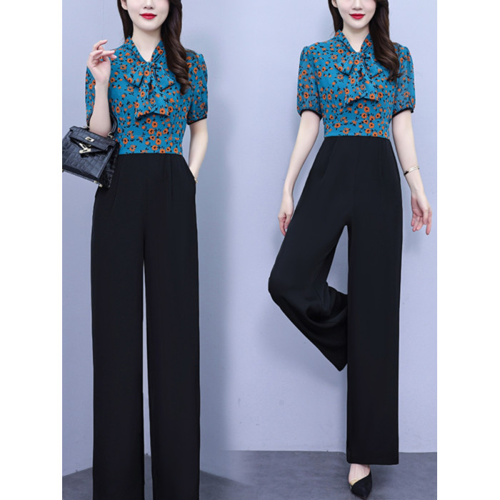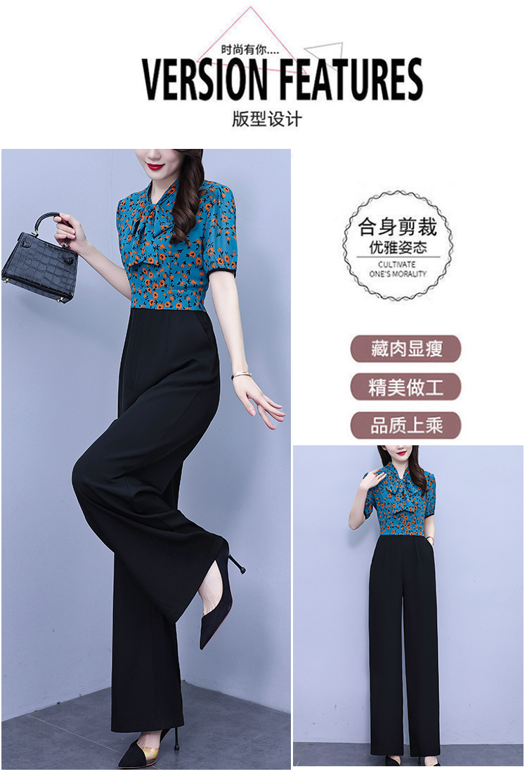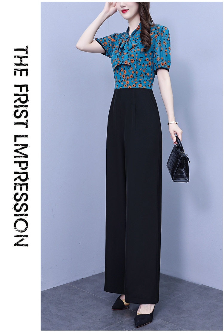 2025年夏裝新款濶腿連體褲假兩件套印花拼接系帶短袖時尚連體衣女