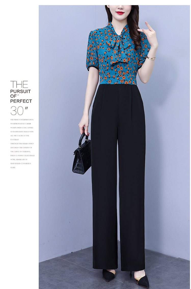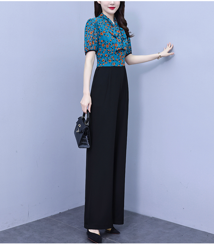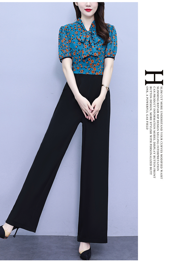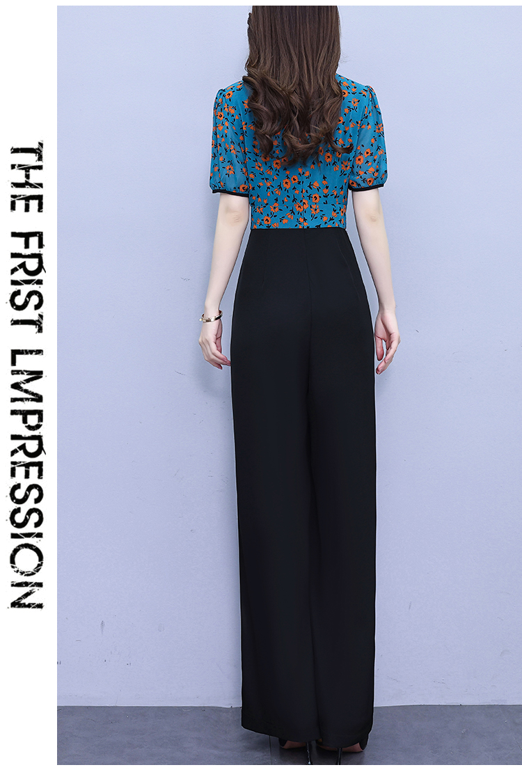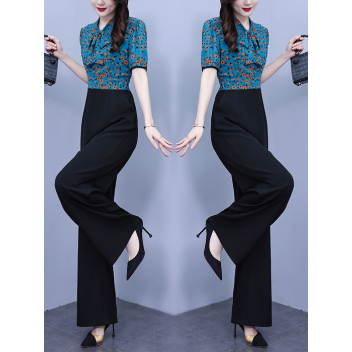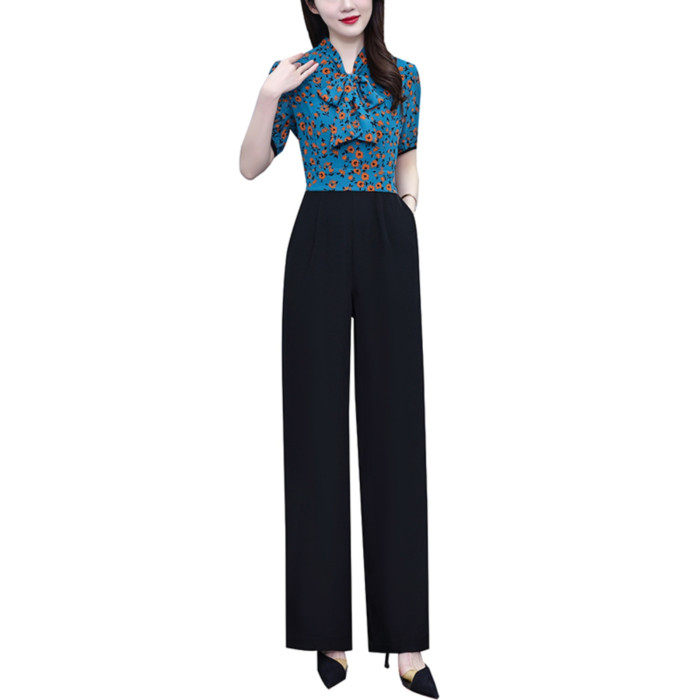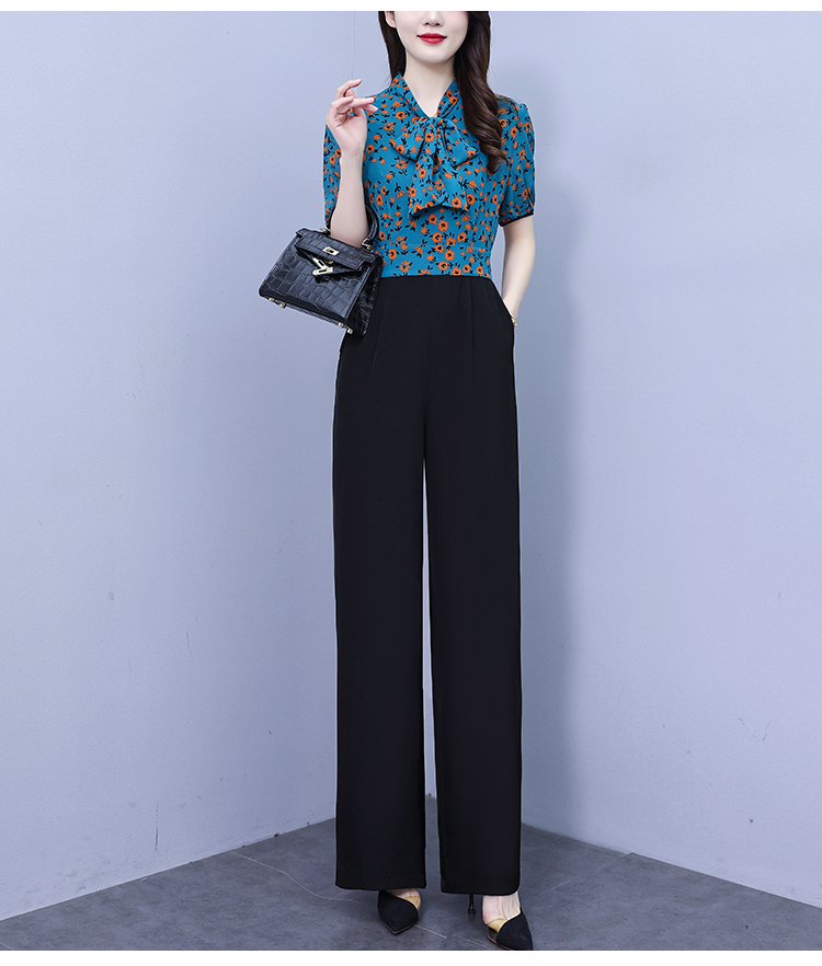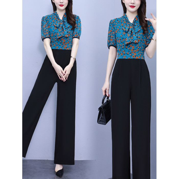 2025年夏裝新款濶腿連體褲假兩件套印花拼接系帶短袖時尚連體衣女