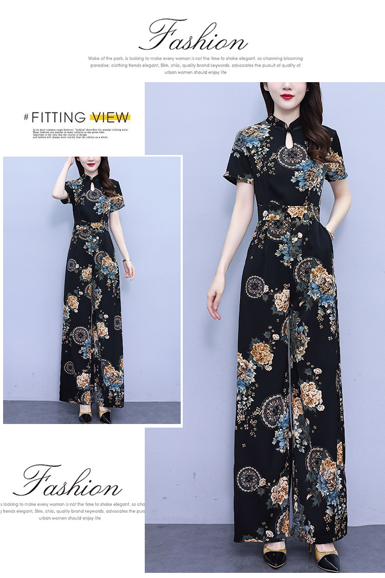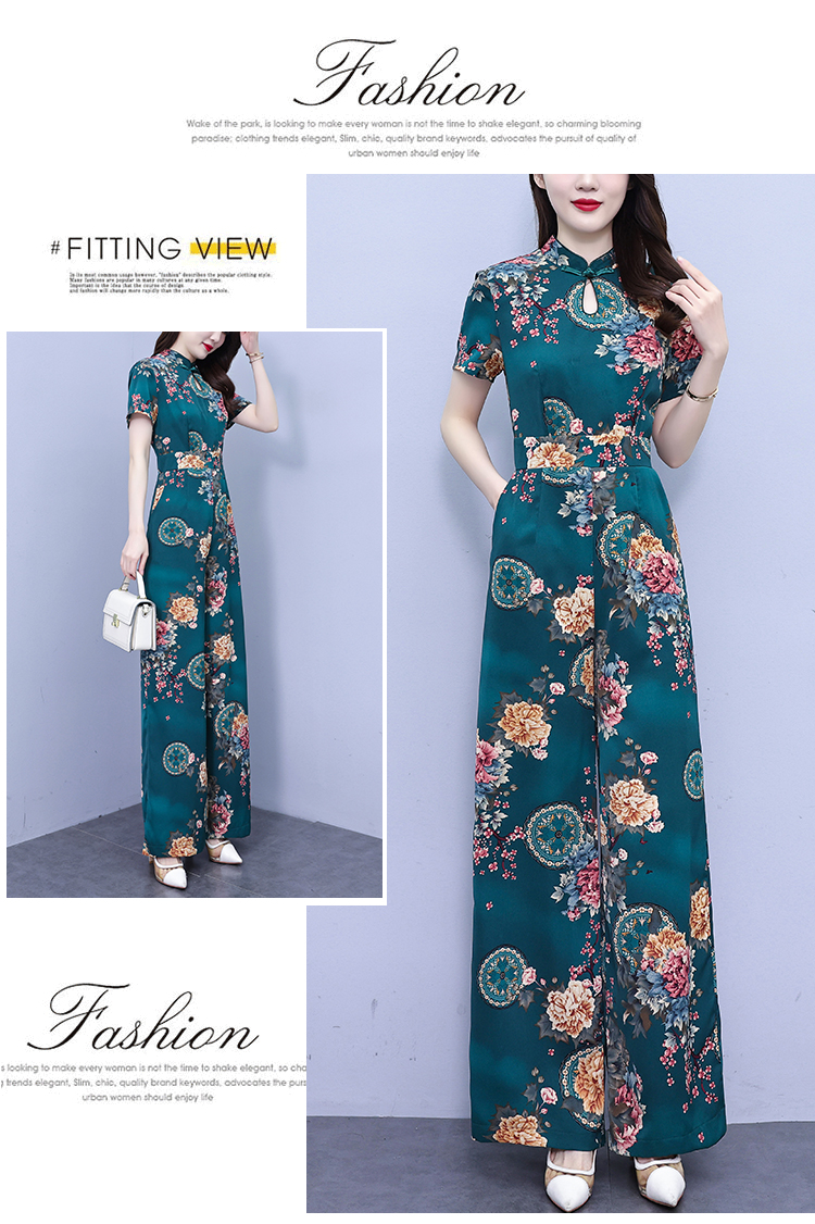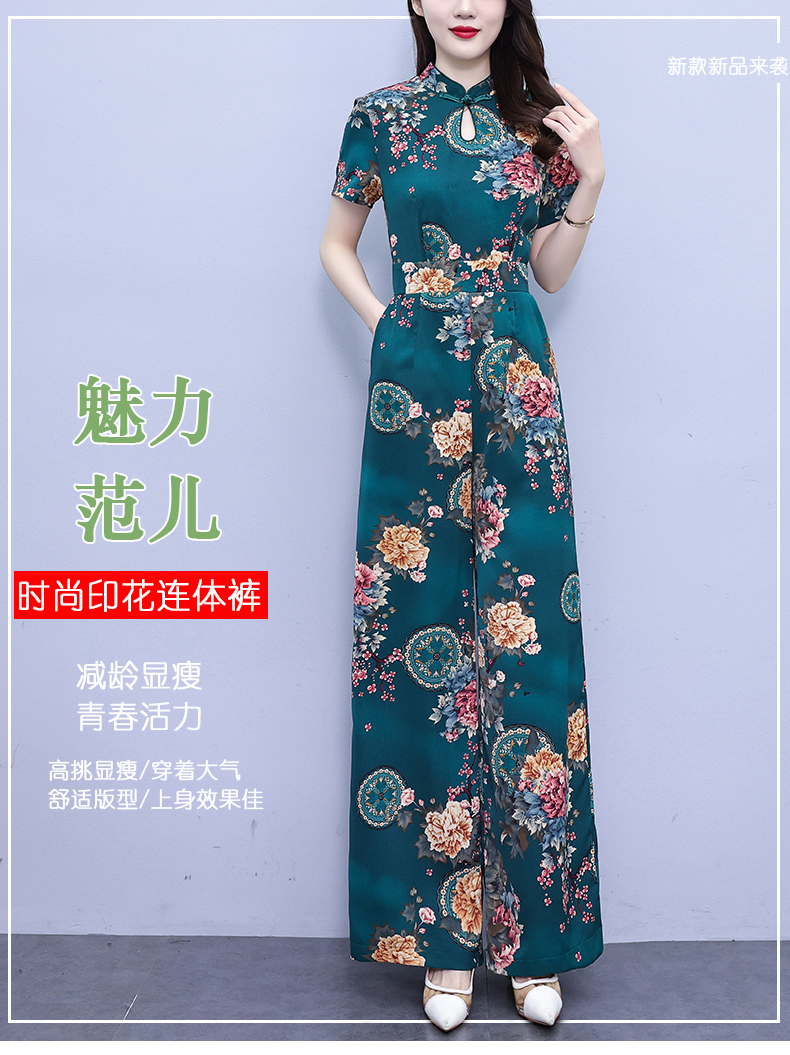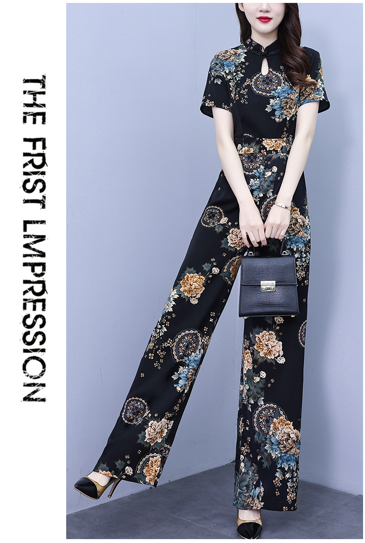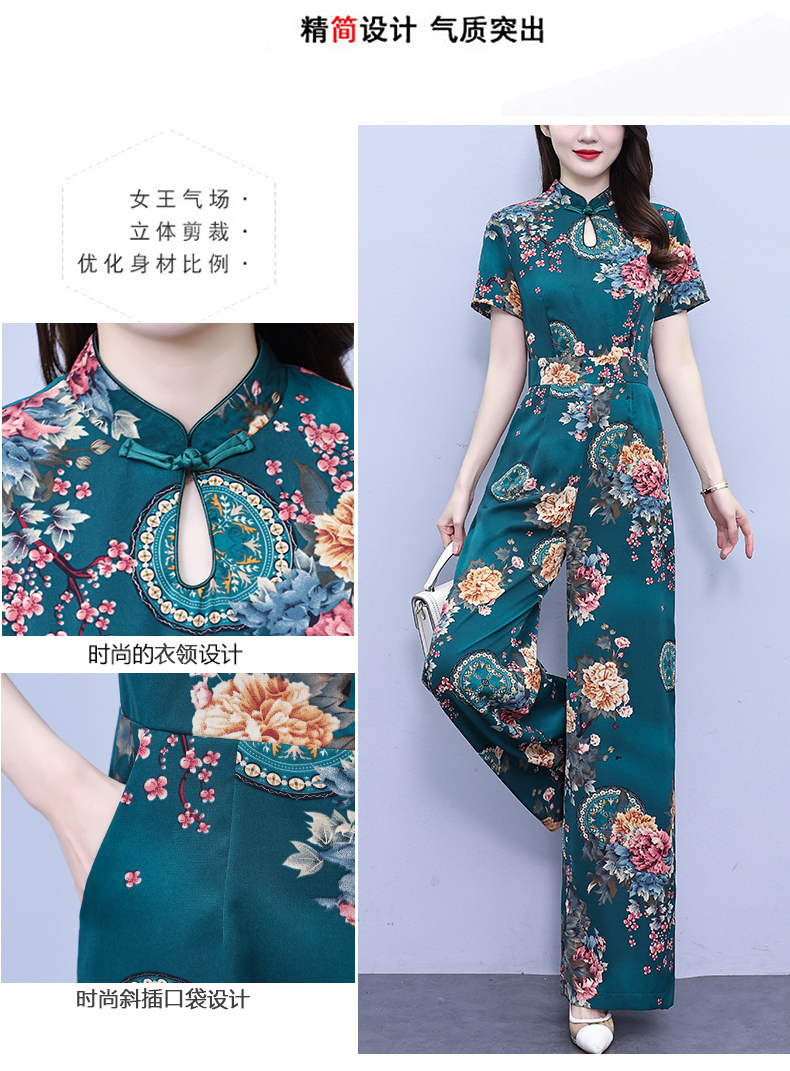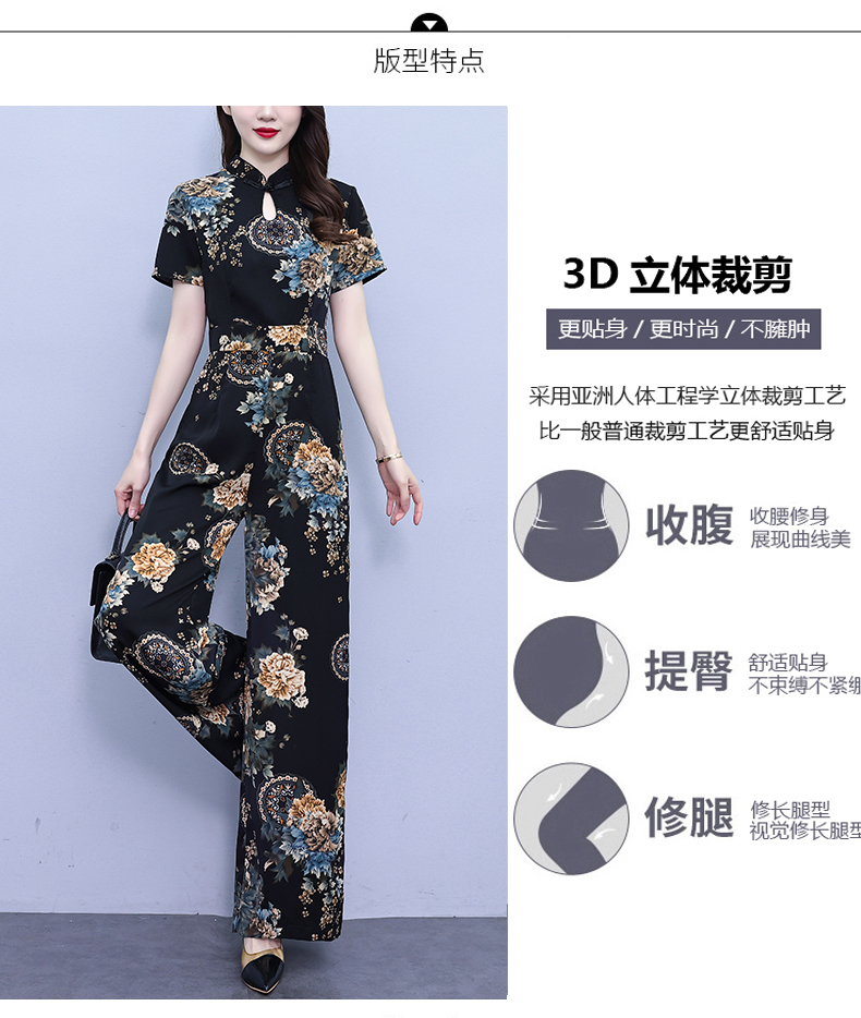 2025年夏天新款中式濶腿連體褲套裝盤釦印花收腰顯瘦短袖連體衣女