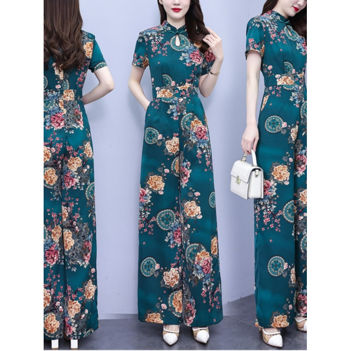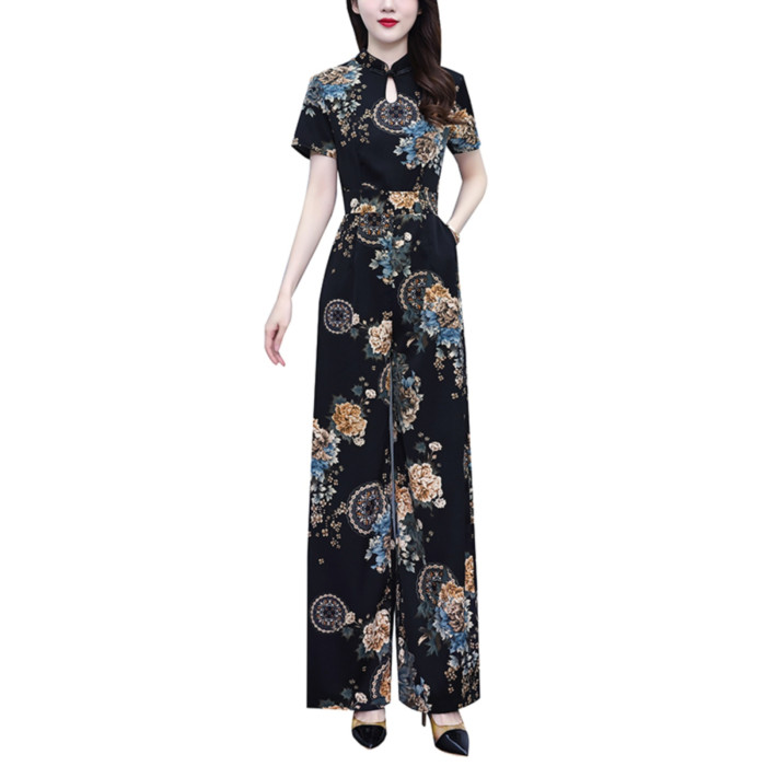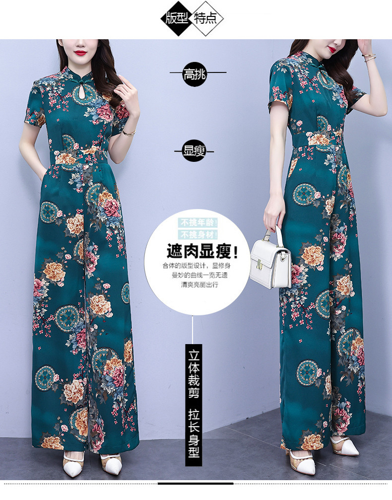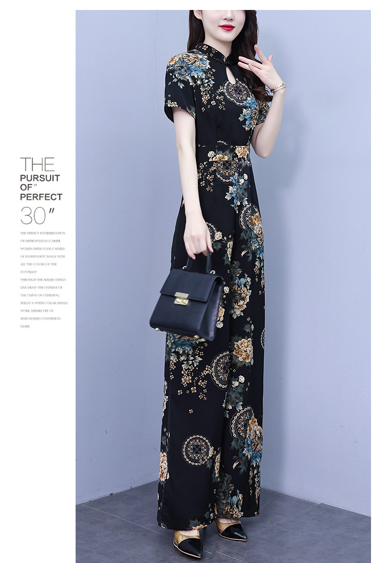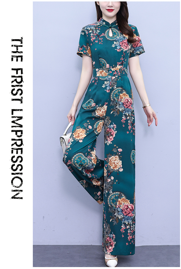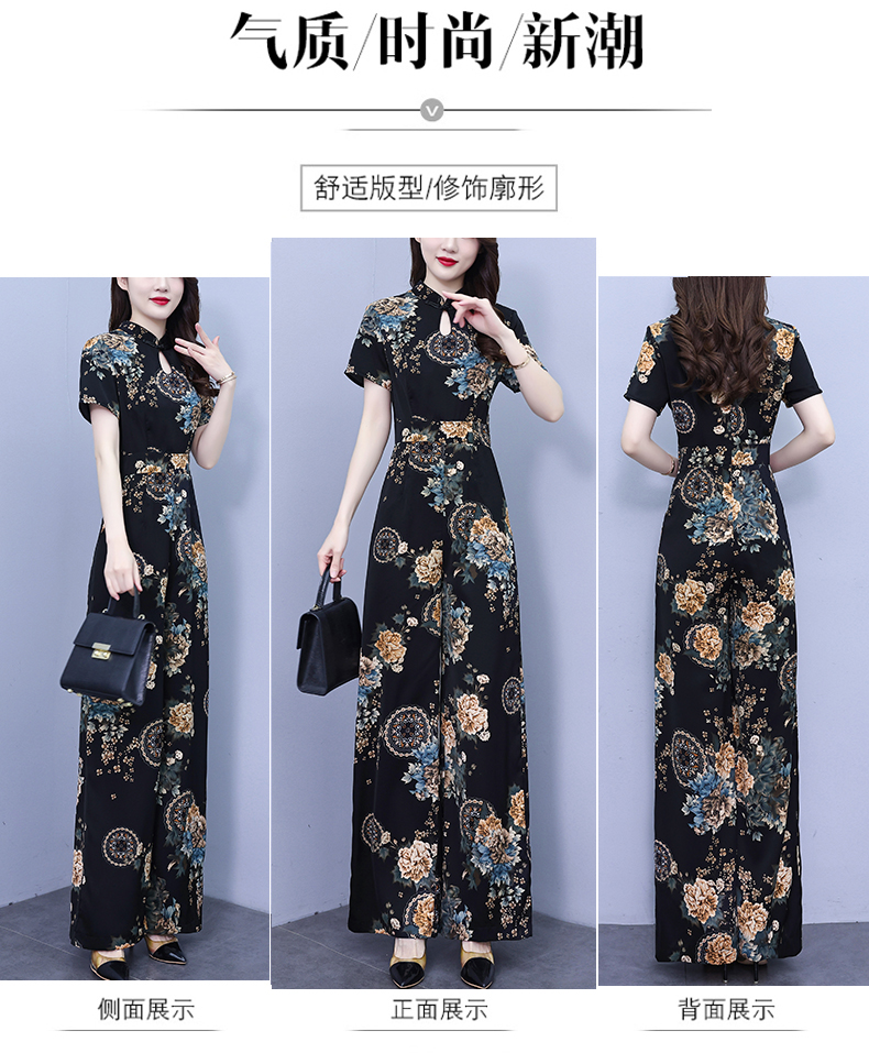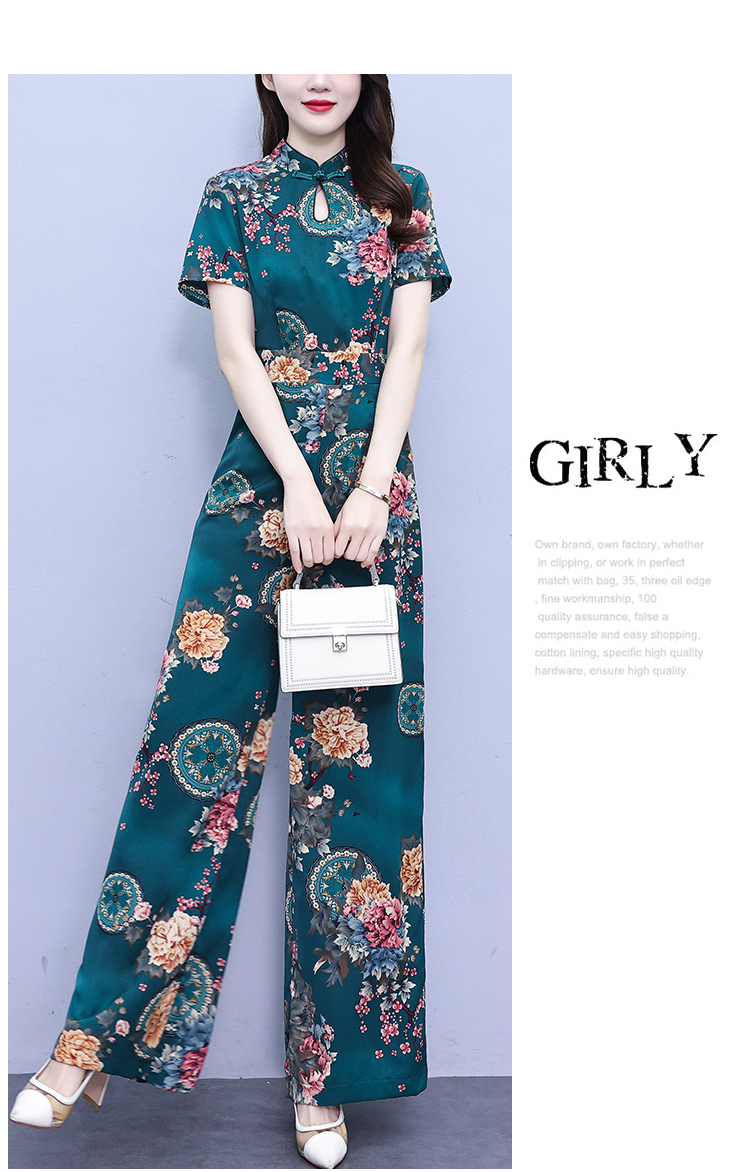2025年夏天新款中式濶腿連體褲套裝盤釦印花收腰顯瘦短袖連體衣女