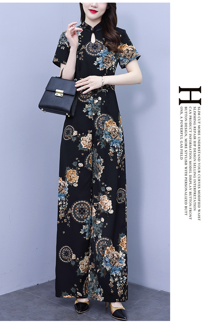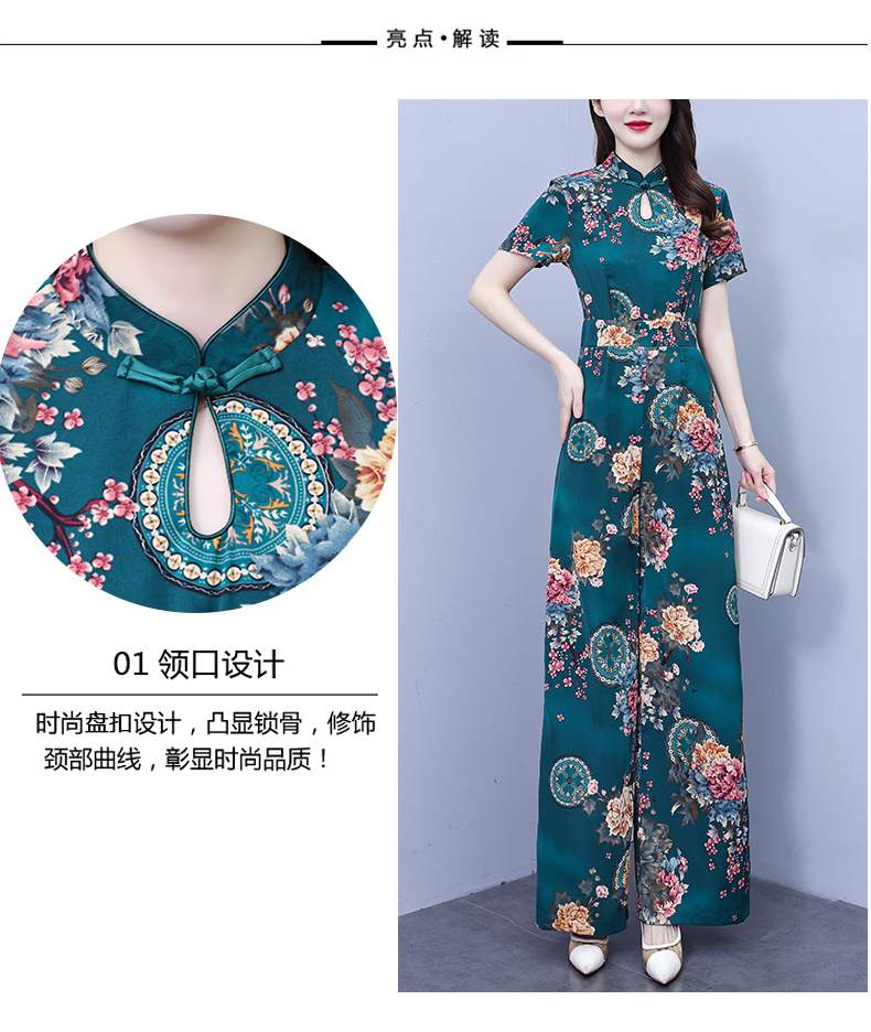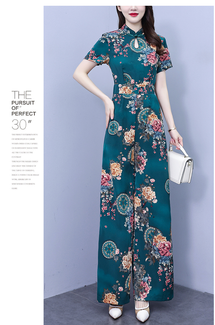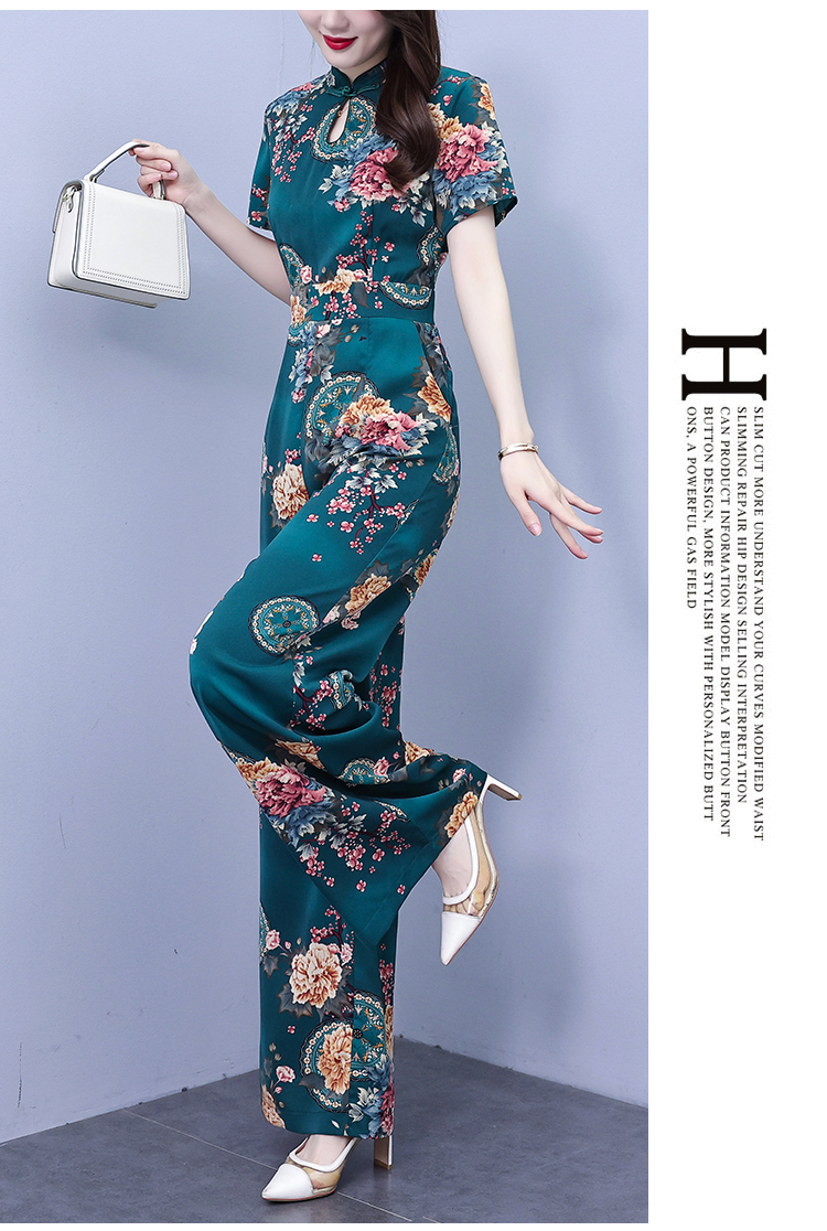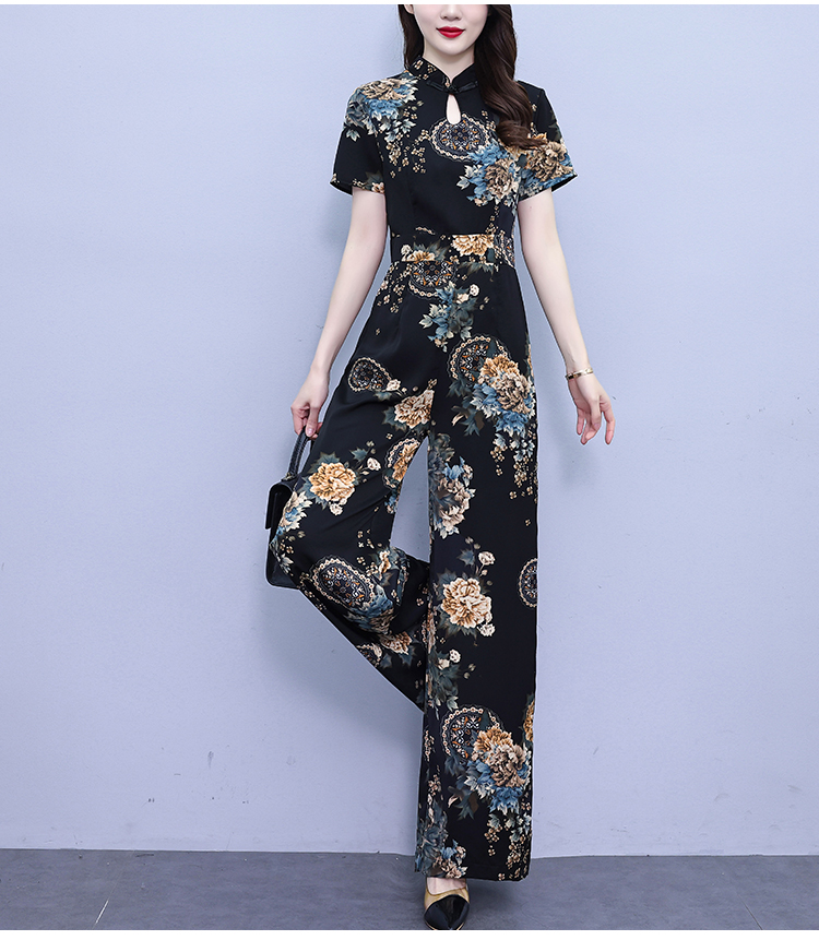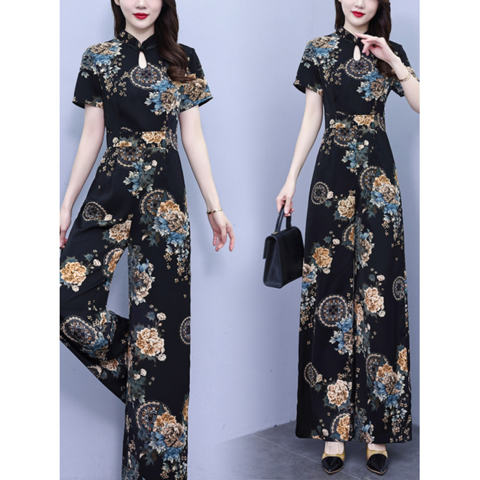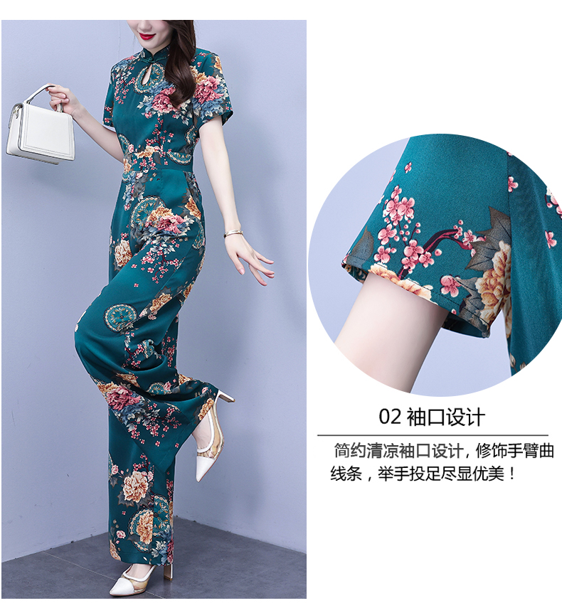 2025年夏天新款中式濶腿連體褲套裝盤釦印花收腰顯瘦短袖連體衣女