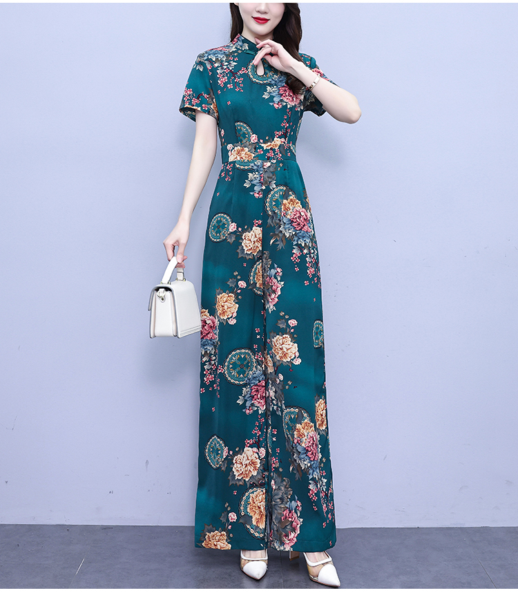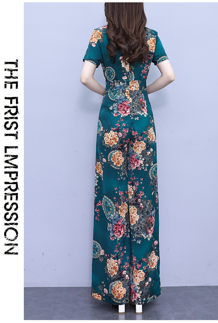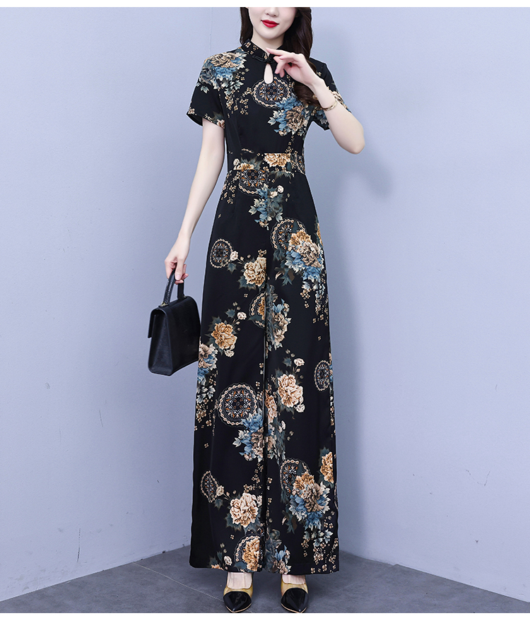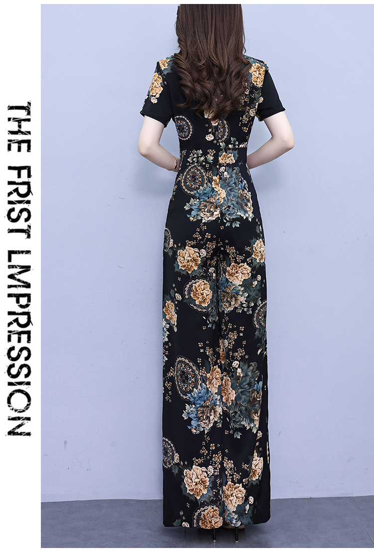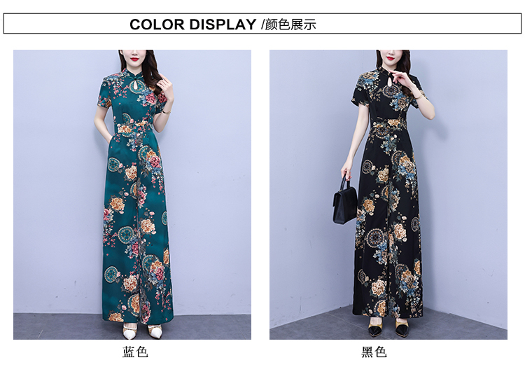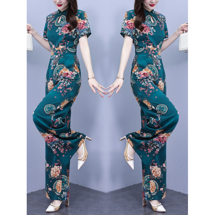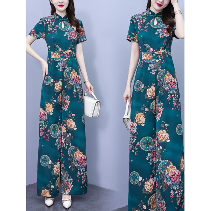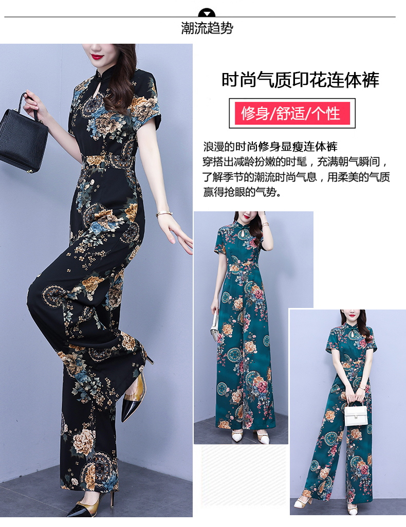 2025年夏天新款中式濶腿連體褲套裝盤釦印花收腰顯瘦短袖連體衣女