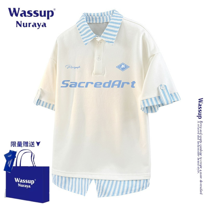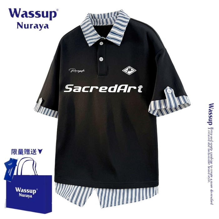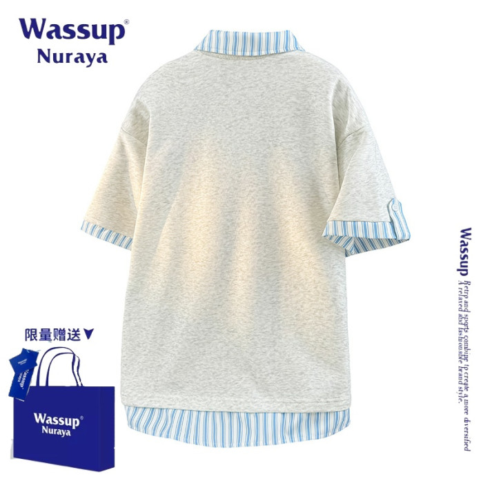 WASSUP NURAYA美式復古假兩件短袖polo衫半袖t恤男士夏季新款T恤