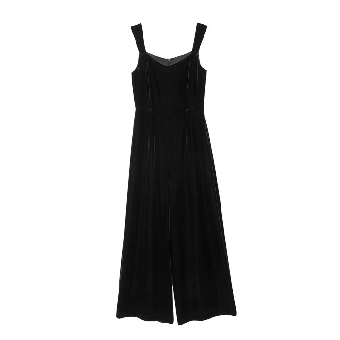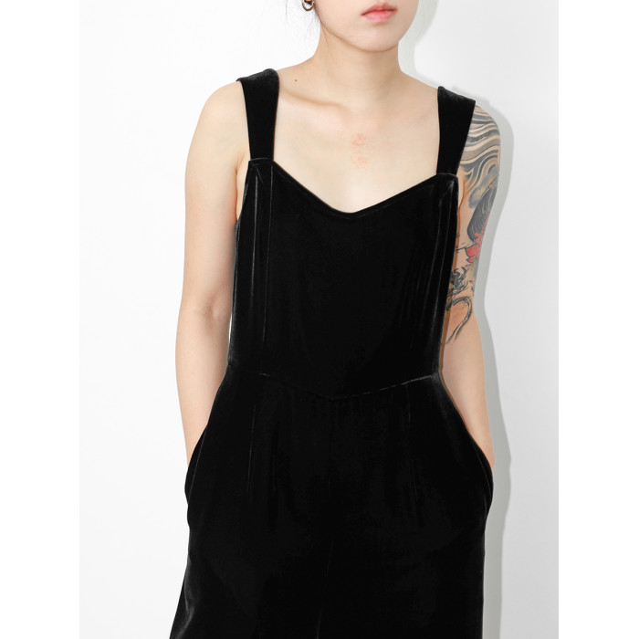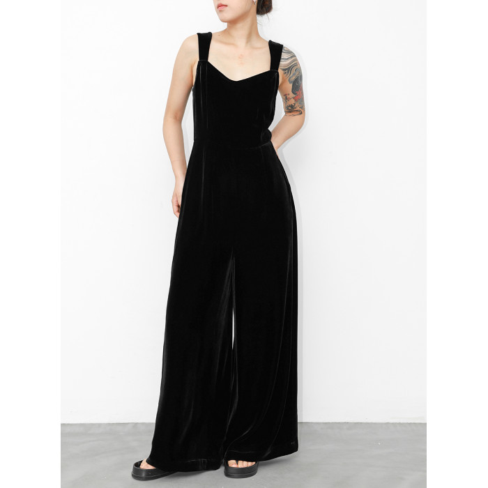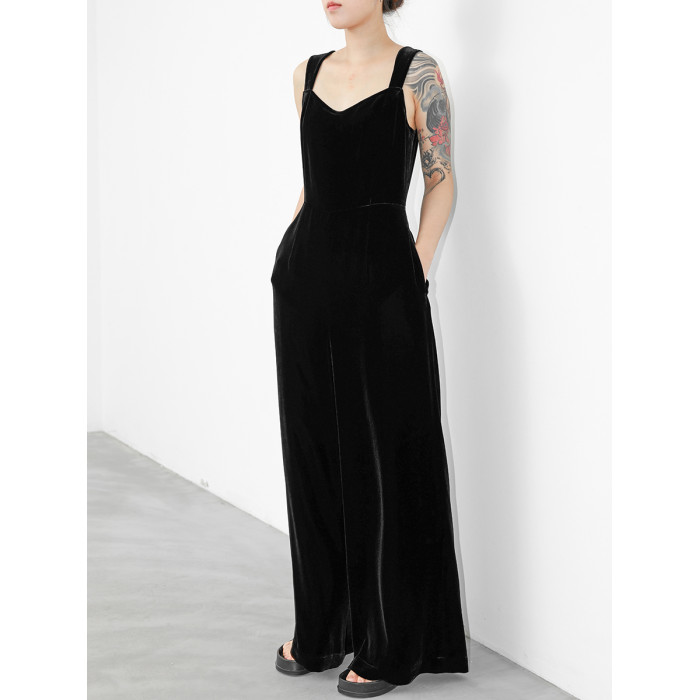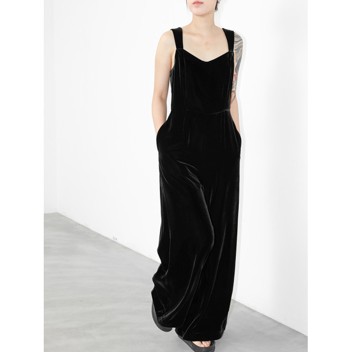 JUZININE原創設計真絲絨連體背帶褲桑蠶絲無袖高腰濶腿褲連體衣