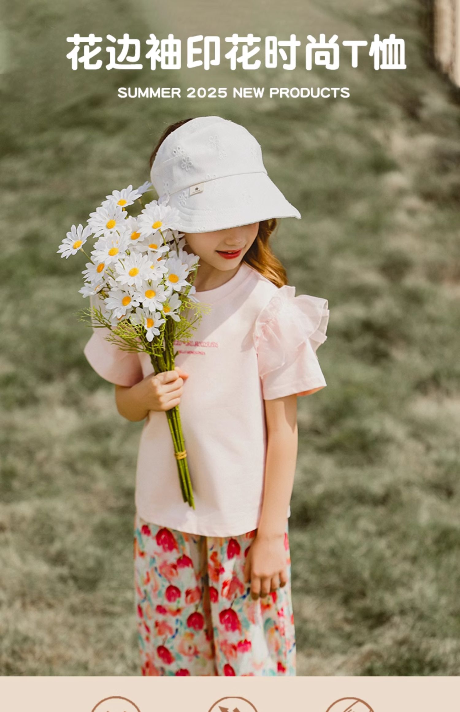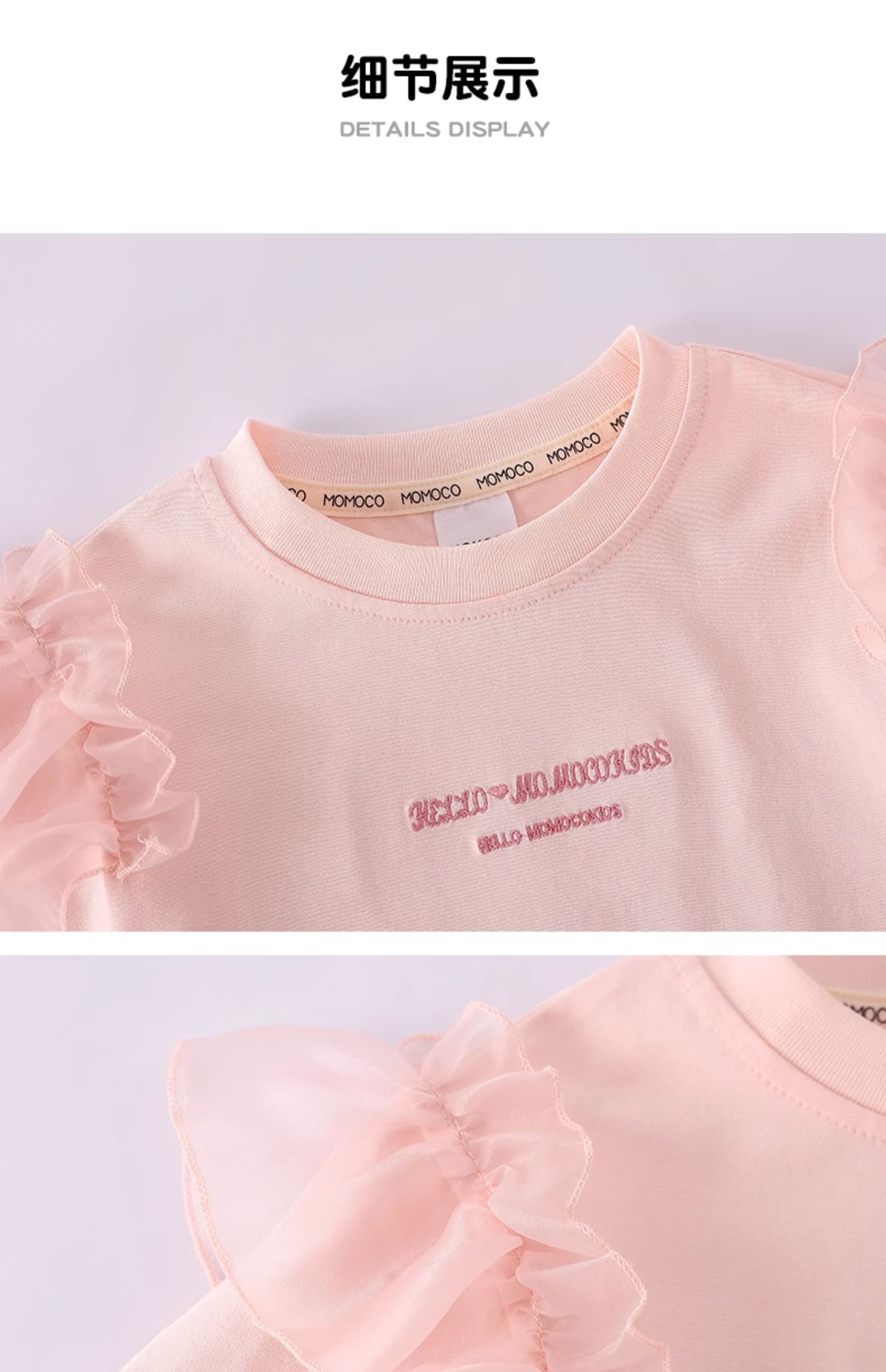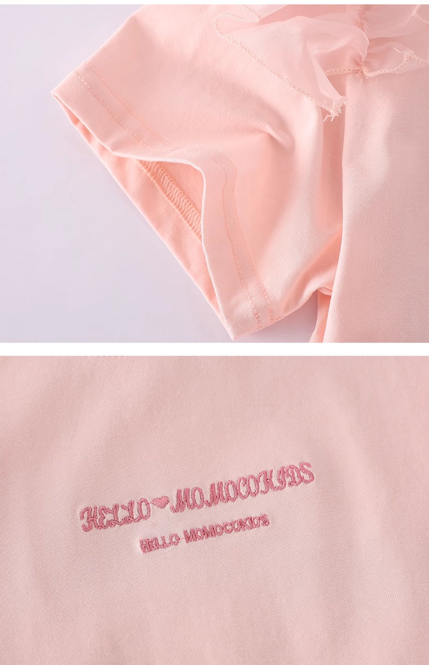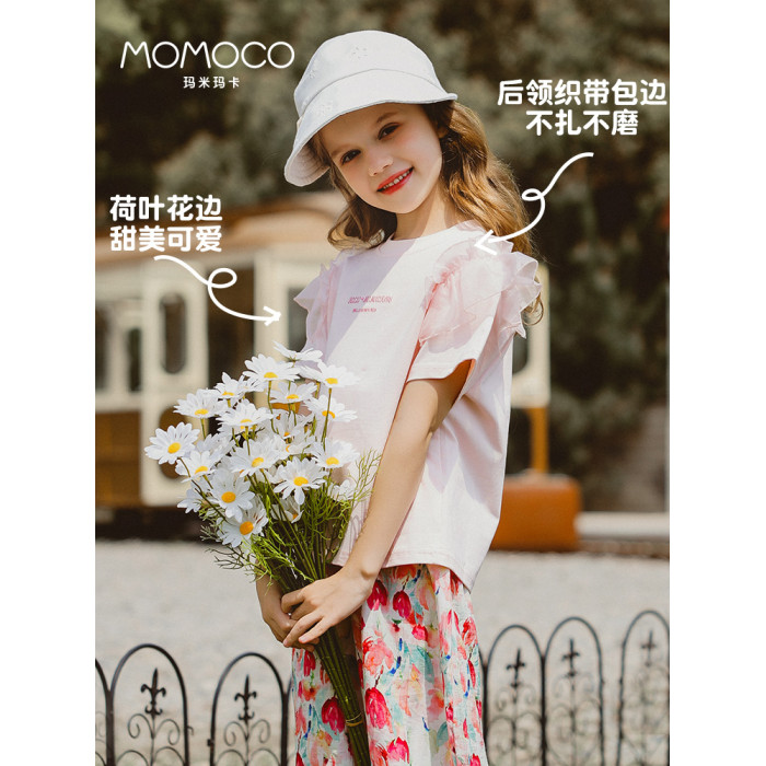 MOMOCO/瑪米瑪卡女童短袖t恤2025夏季新款兒童網紗甜美花邊袖上衣