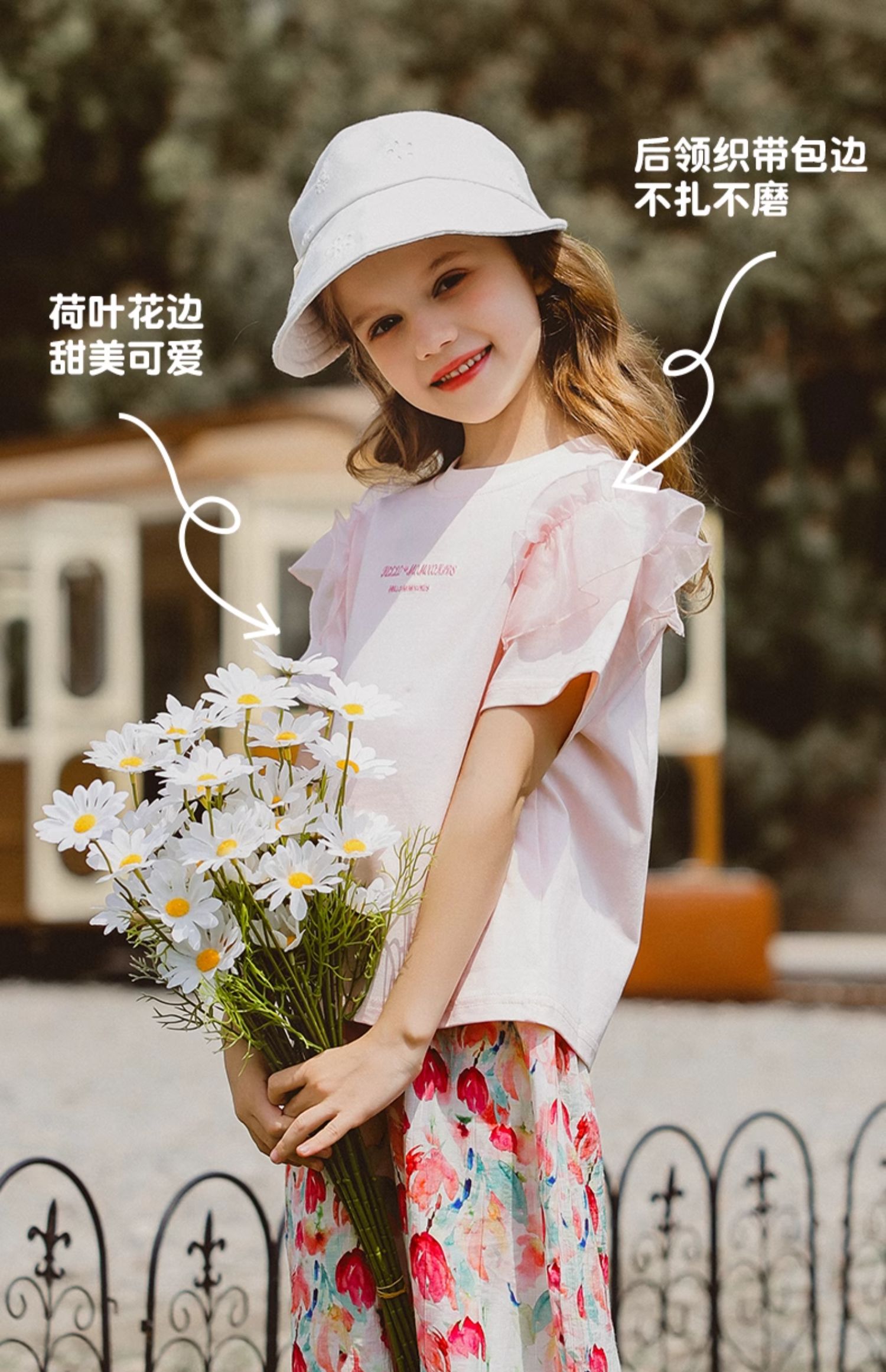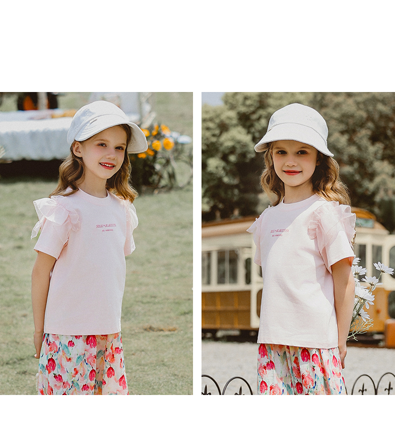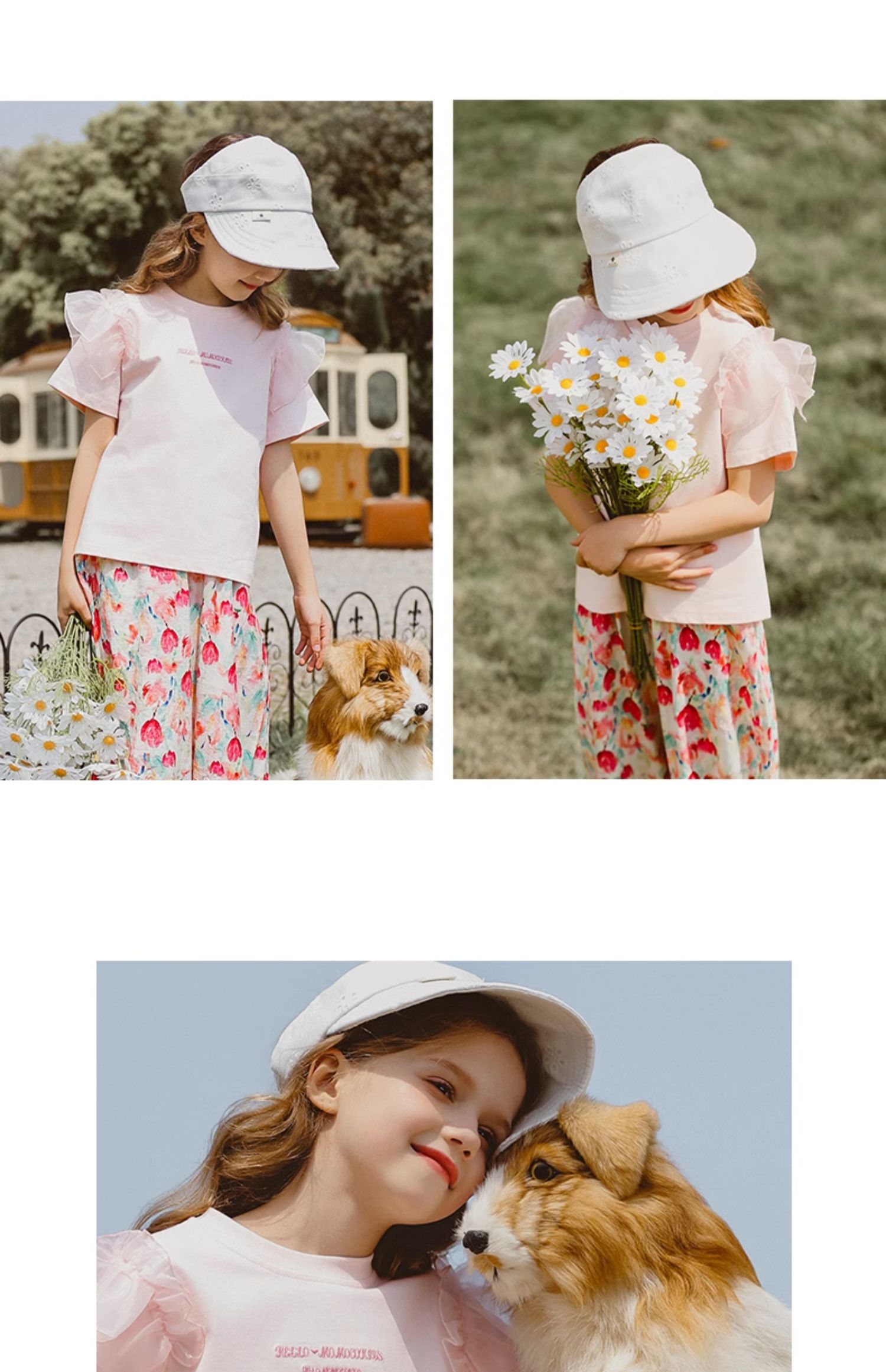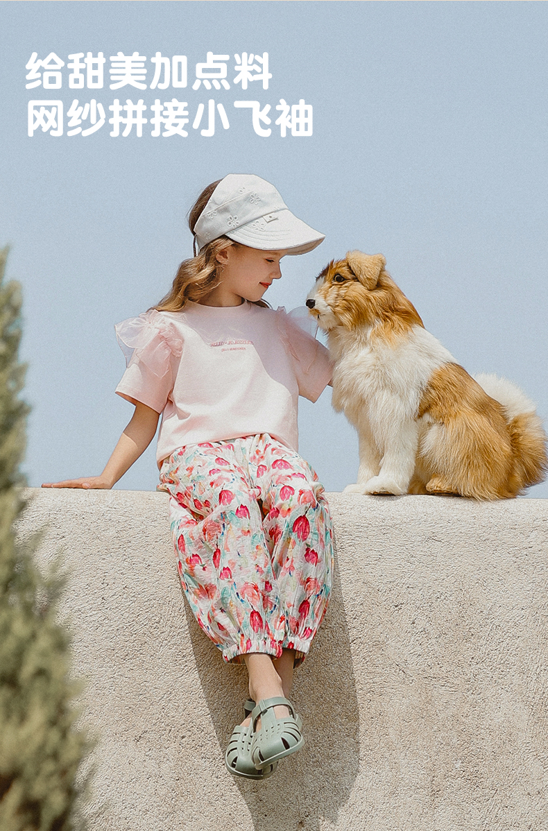 MOMOCO/瑪米瑪卡女童短袖t恤2025夏季新款兒童網紗甜美花邊袖上衣