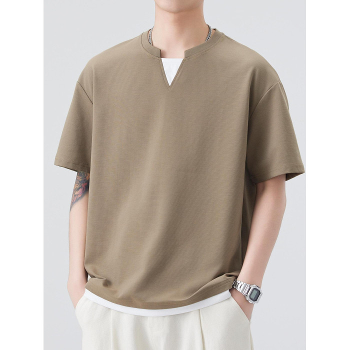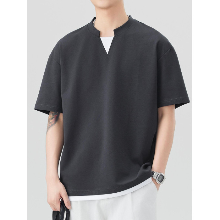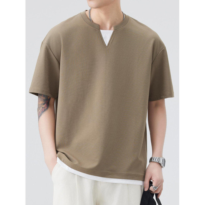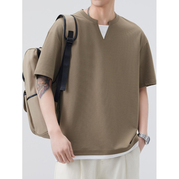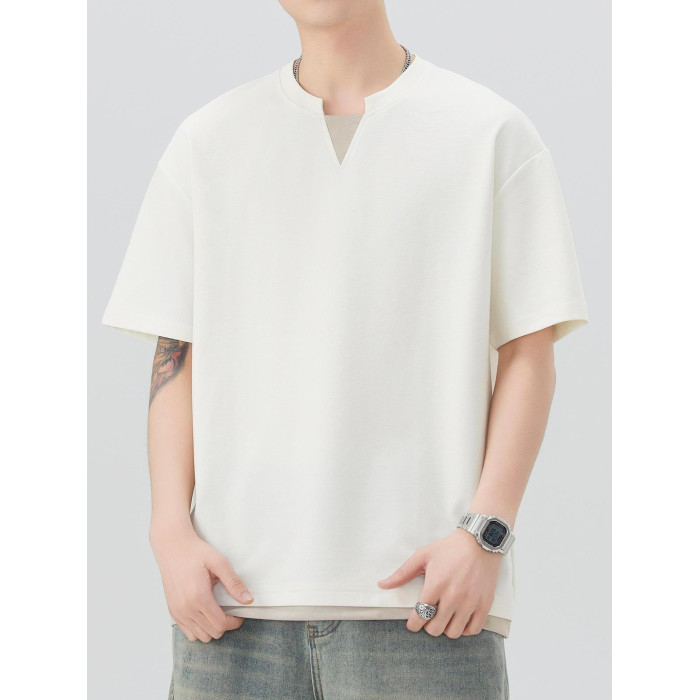 美式假兩件剪刀領短袖t恤男夏季2025新款潮牌撞色寬松休閒體恤衫