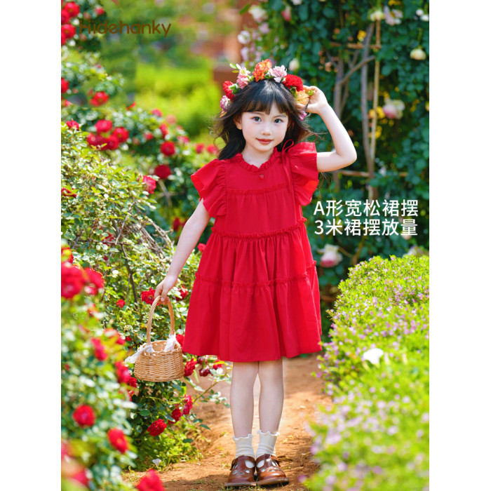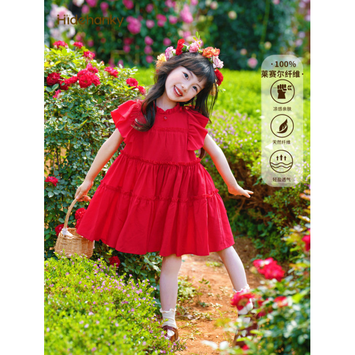 丟手絹女童紅色連衣裙天絲度假風萊賽爾兒童裙子公主夏法式木耳邊