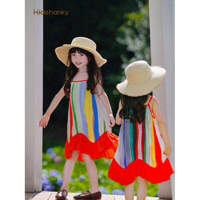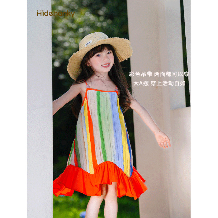 丟手絹大童裝女童彩虹吊帶連衣裙法式度假風裙子多巴胺海邊沙灘裙