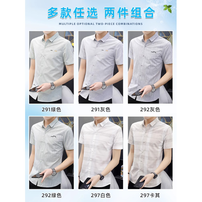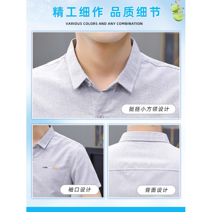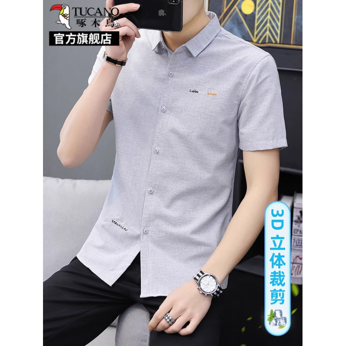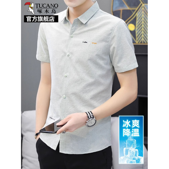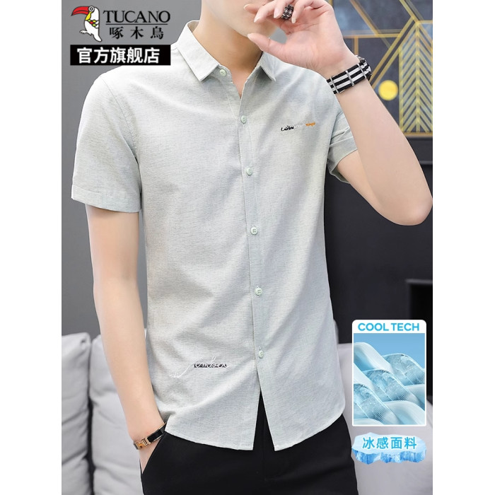 啄木鳥冰絲短袖襯衫男士夏季薄款休閒商務立領襯衣修身半袖上衣K