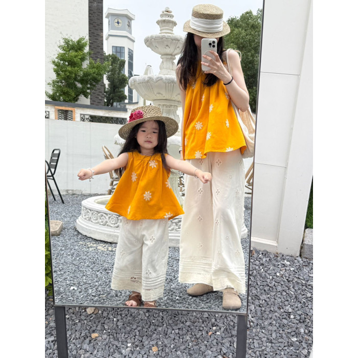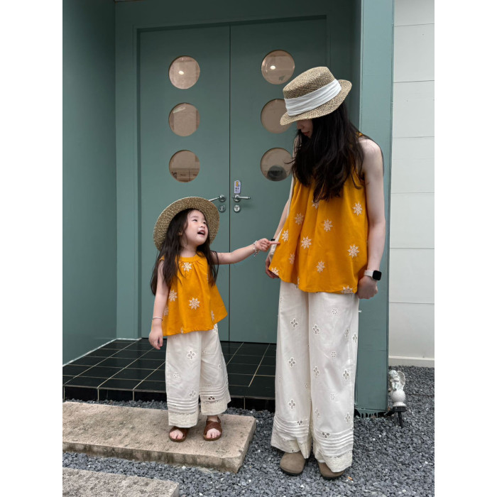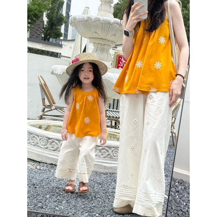 森系網紅親子裝母女夏季背心2025新款高級洋氣度假時尚濶腿褲套裝