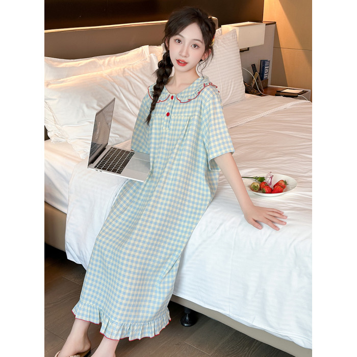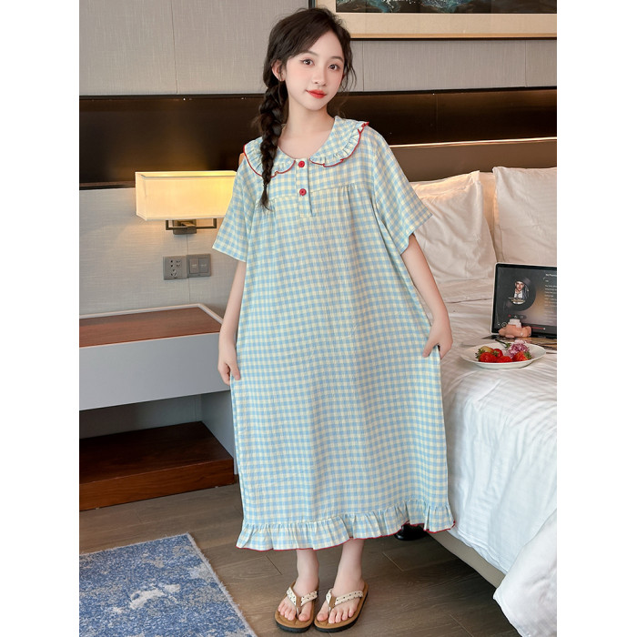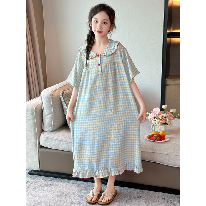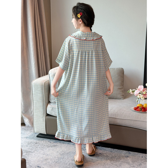 女童睡裙2025新款夏季兒童短袖薄款家居服女孩長款格子睡衣親子裝