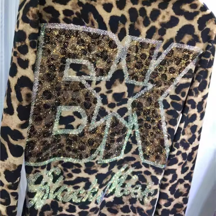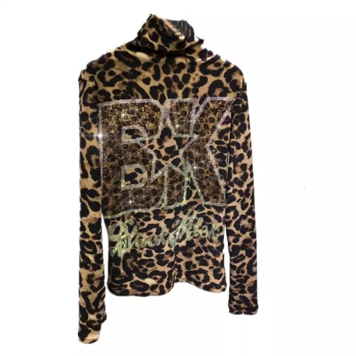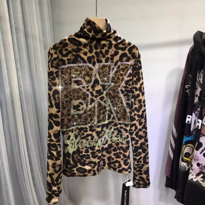 特大碼300斤重工燙鑽打底衫女高領加厚秋冬季長袖豹紋顯瘦上衣潮