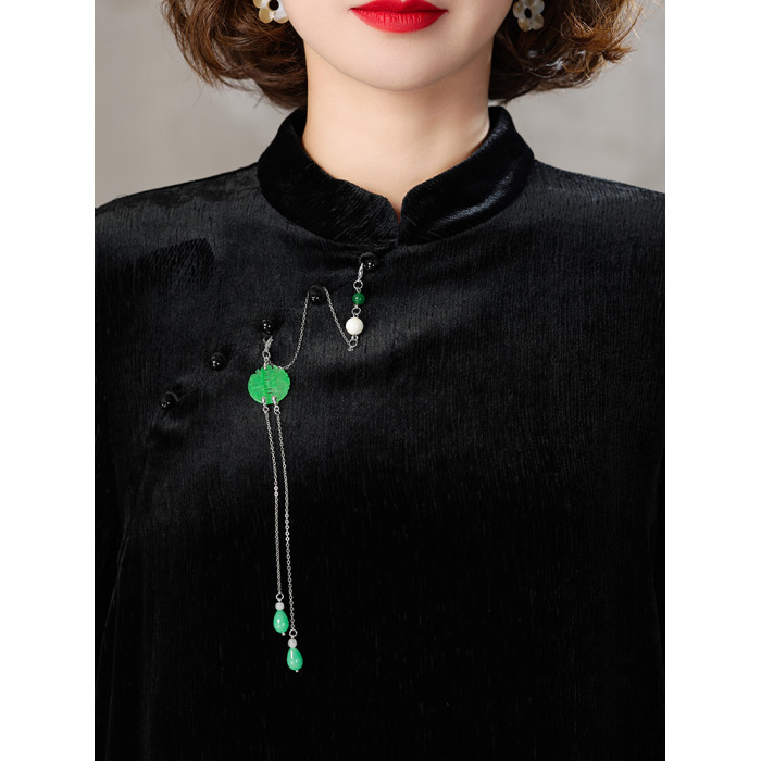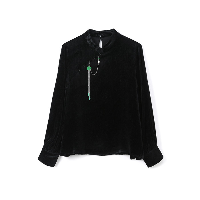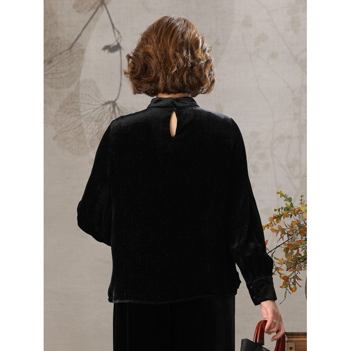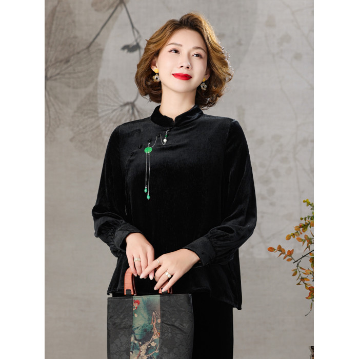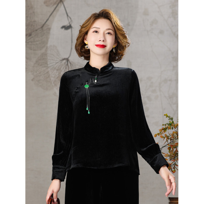 媽媽秋冬新款絲絨真絲旗袍上衣女長袖貴夫人品牌女裝桑蠶絲打底衫