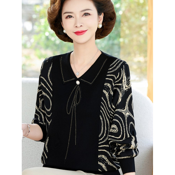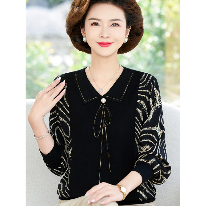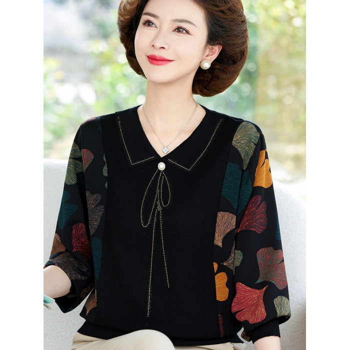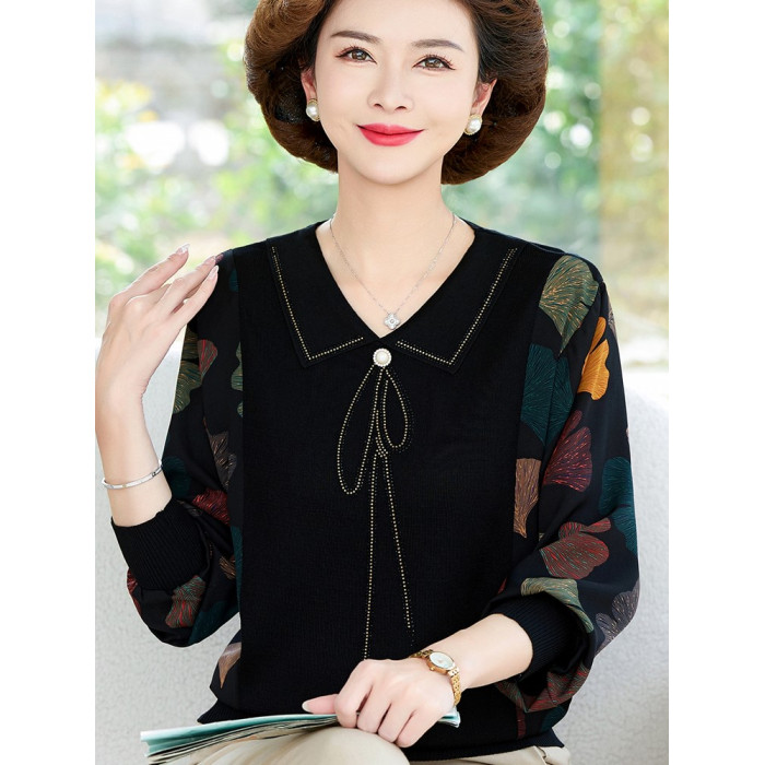媽媽裝新款雪紡拼接襯衫中老年女寬松休閒上衣春秋長袖針織打底衫