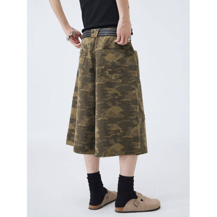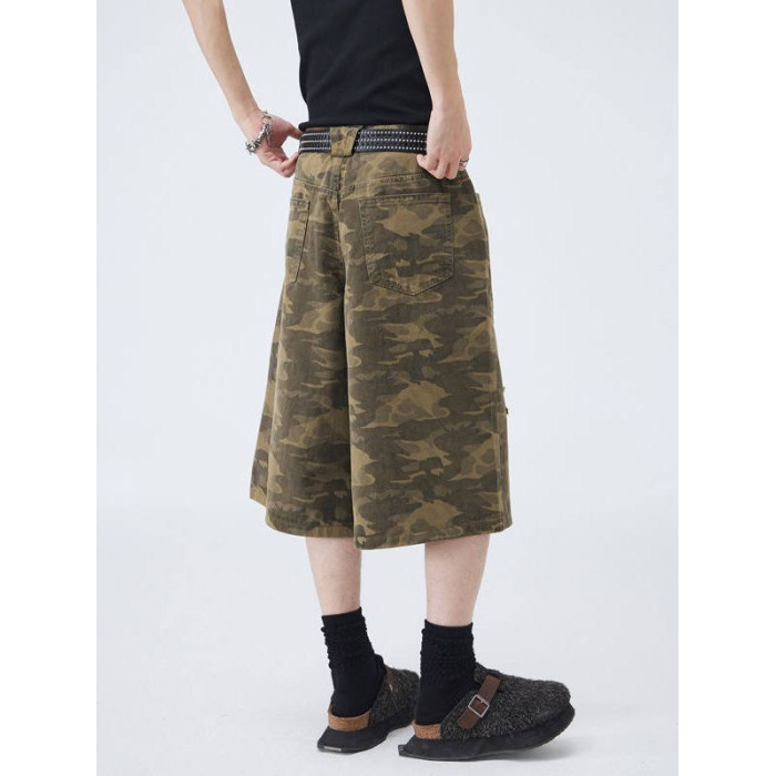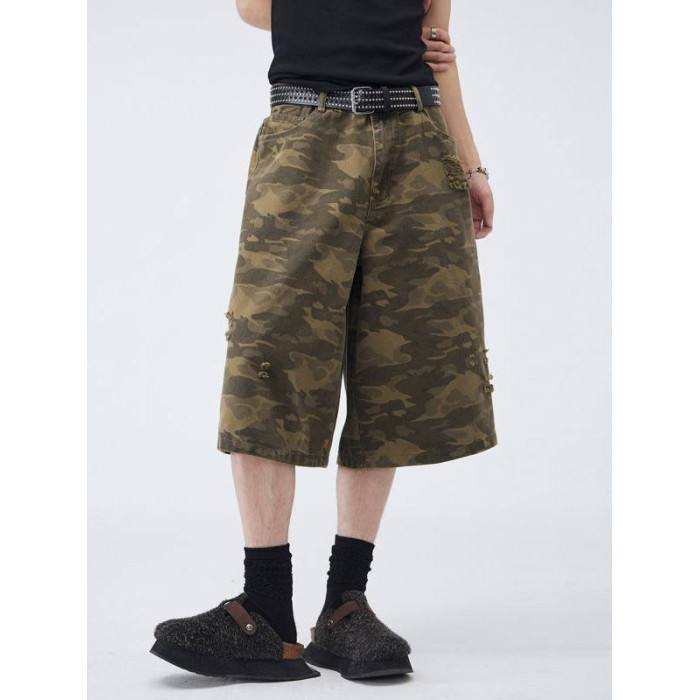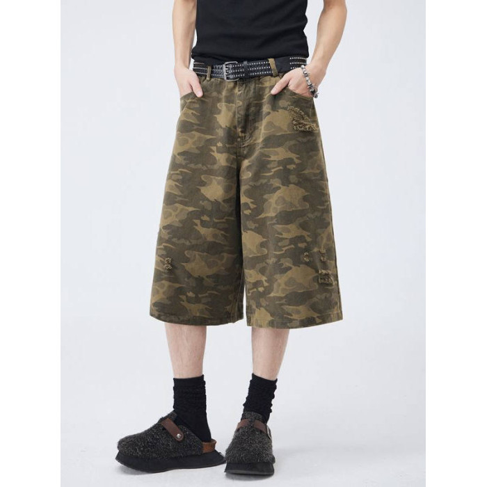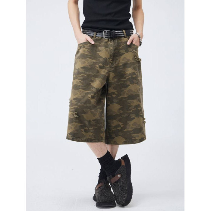 2025美式復古迷彩水洗牛仔七分褲男夏季濶腿不規則破洞直筒寬松