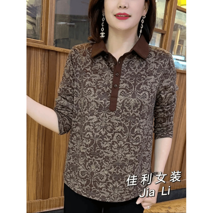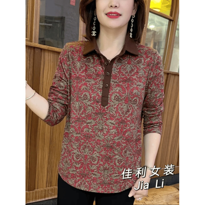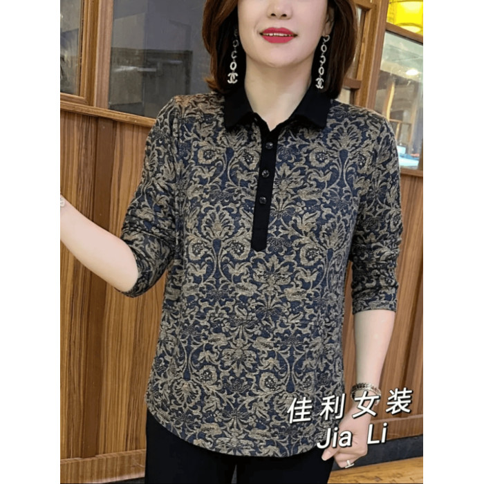 秋季新款長袖衛衣氣質百搭減齡媽媽裝時尚翻領長袖復古提花打底衫