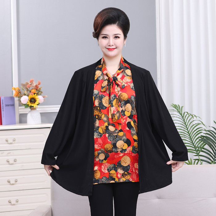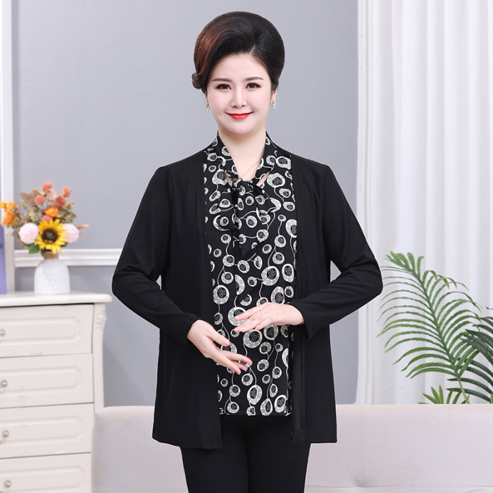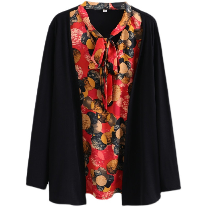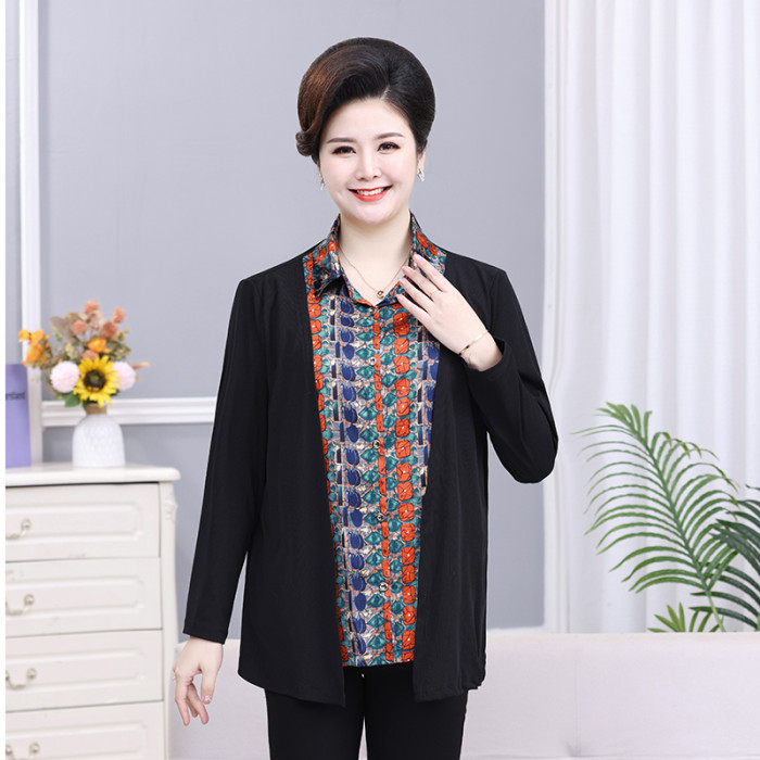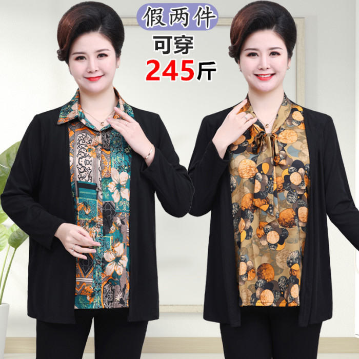 媽媽女裝時尚假兩件打底衫中年洋氣加肥加大碼春秋中老年長袖上衣