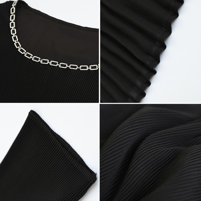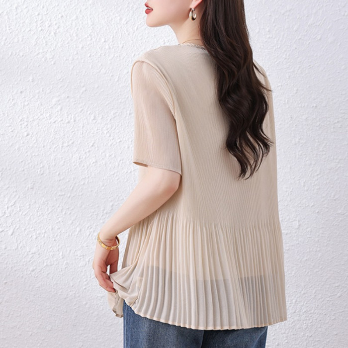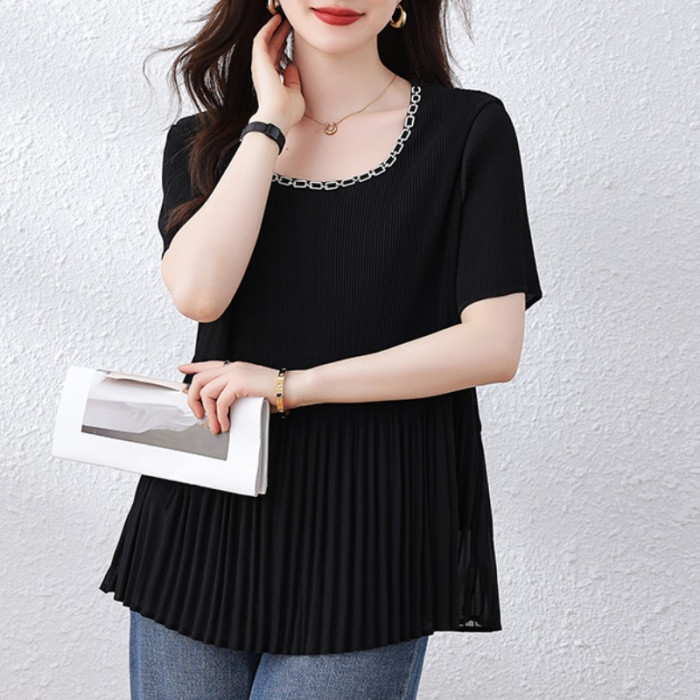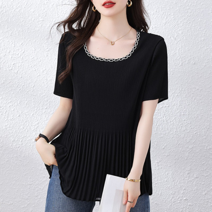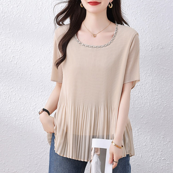 九月墨陌釘鑽壓皺雪紡衫女夏季新款短袖上衣歐貨打底衫大碼女裝潮