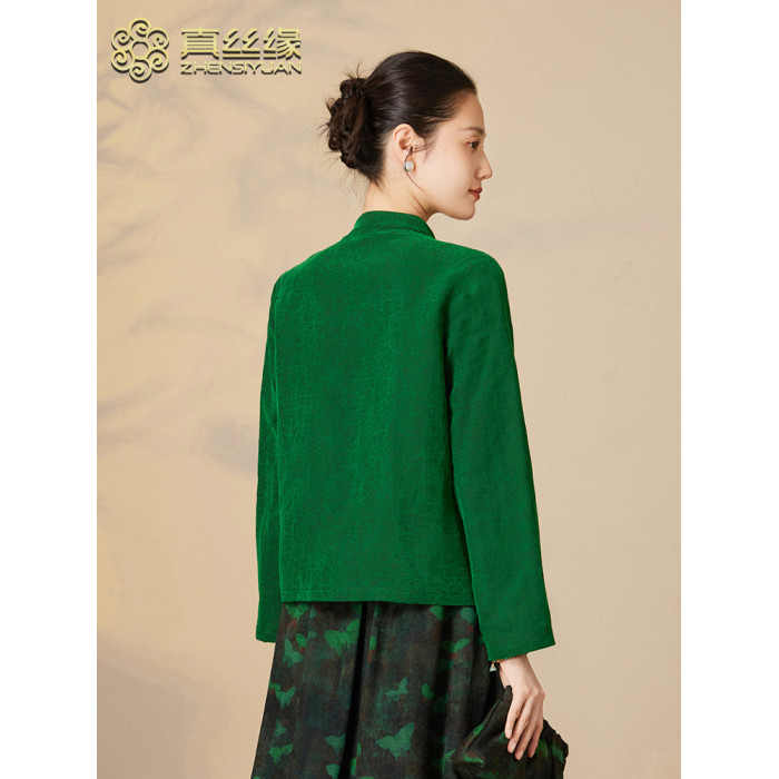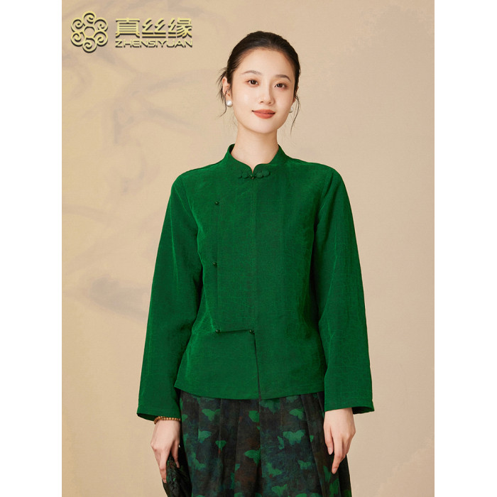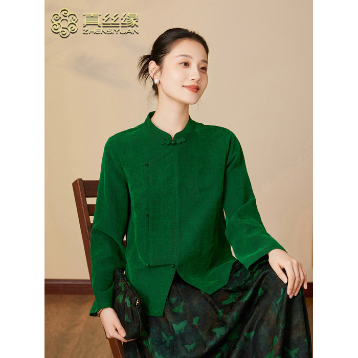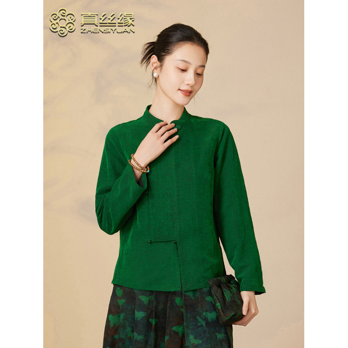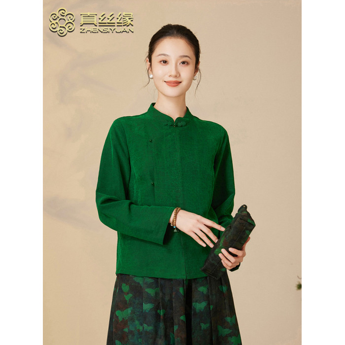 真絲緣綠色香雲紗龜裂紋上衣襯衫開衫新中式國風打底衫立領女