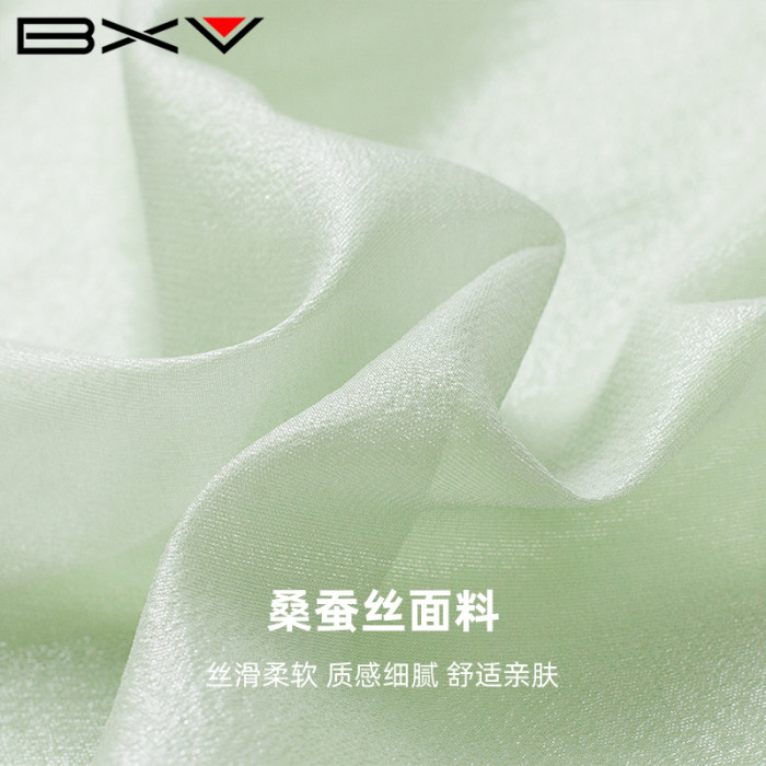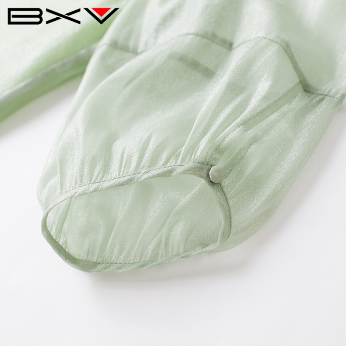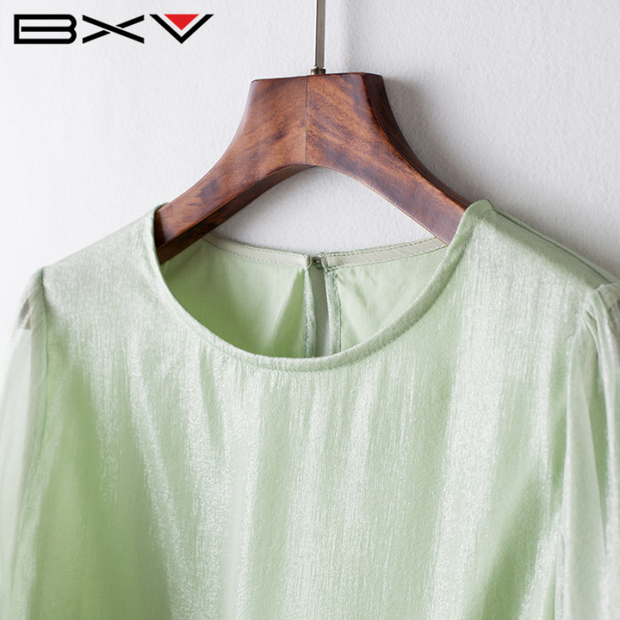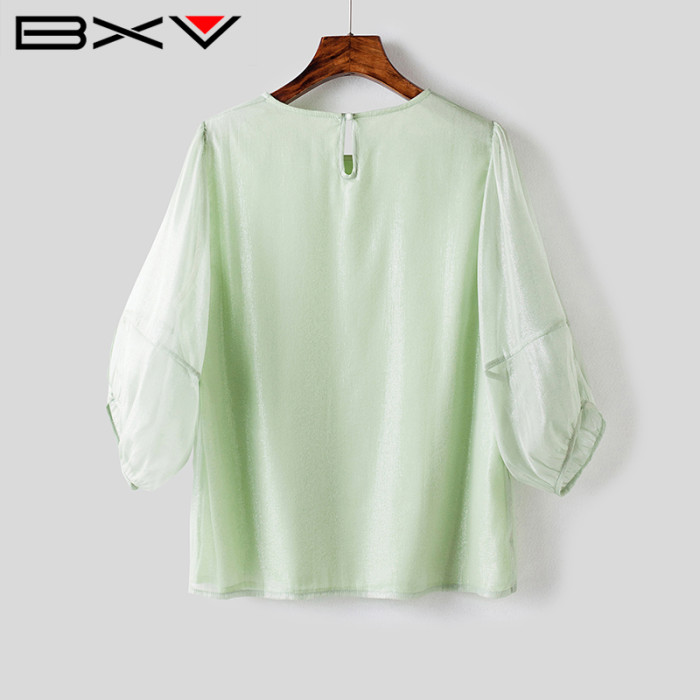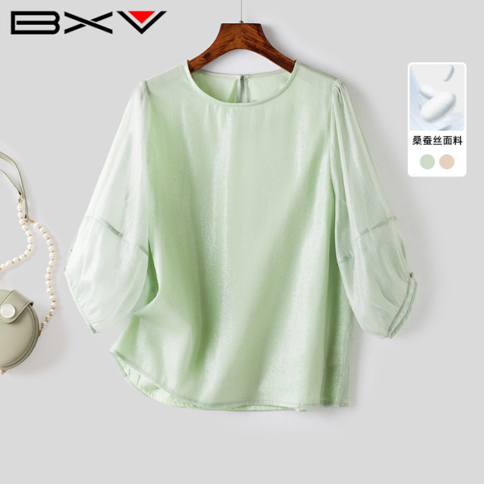 BXV燈籠袖真絲襯衫女2024夏季新款簡約淺綠色七分袖桑蠶絲打底衫