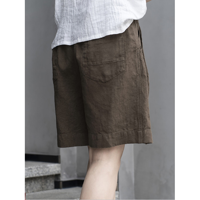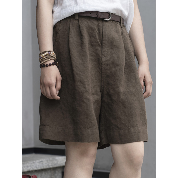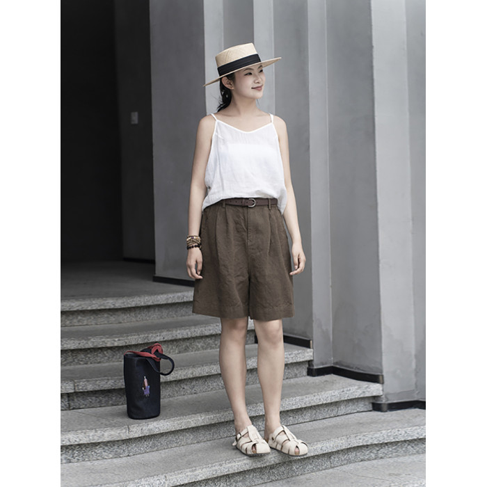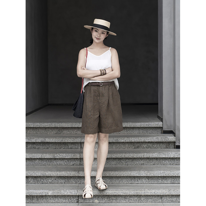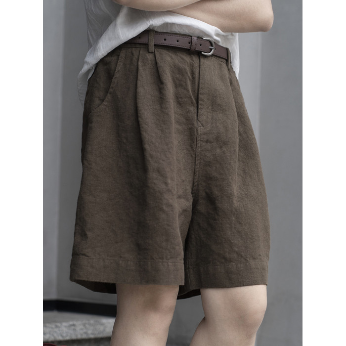 雨文她城原創土黃軍綠色漢麻簡約寬松女短褲chao有型高質感五分褲