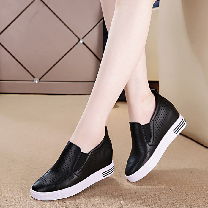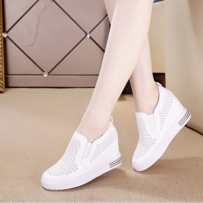 涼鞋女2024春季新款坡跟真皮單鞋鏤空透氣網內增高低幫女鞋小白鞋