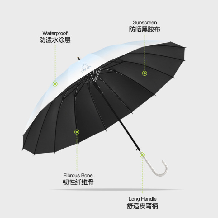 新款新品黑膠16K自動直桿漸變色雨繖皮彎柄繖加印廣告繖