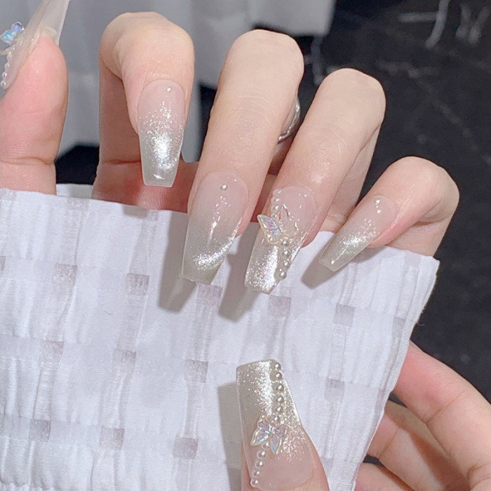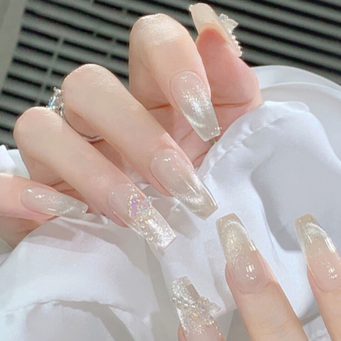 清冷白茶貓眼純手工穿戴甲蝴蝶結高級感氣質顯白新娘美甲貼片指甲