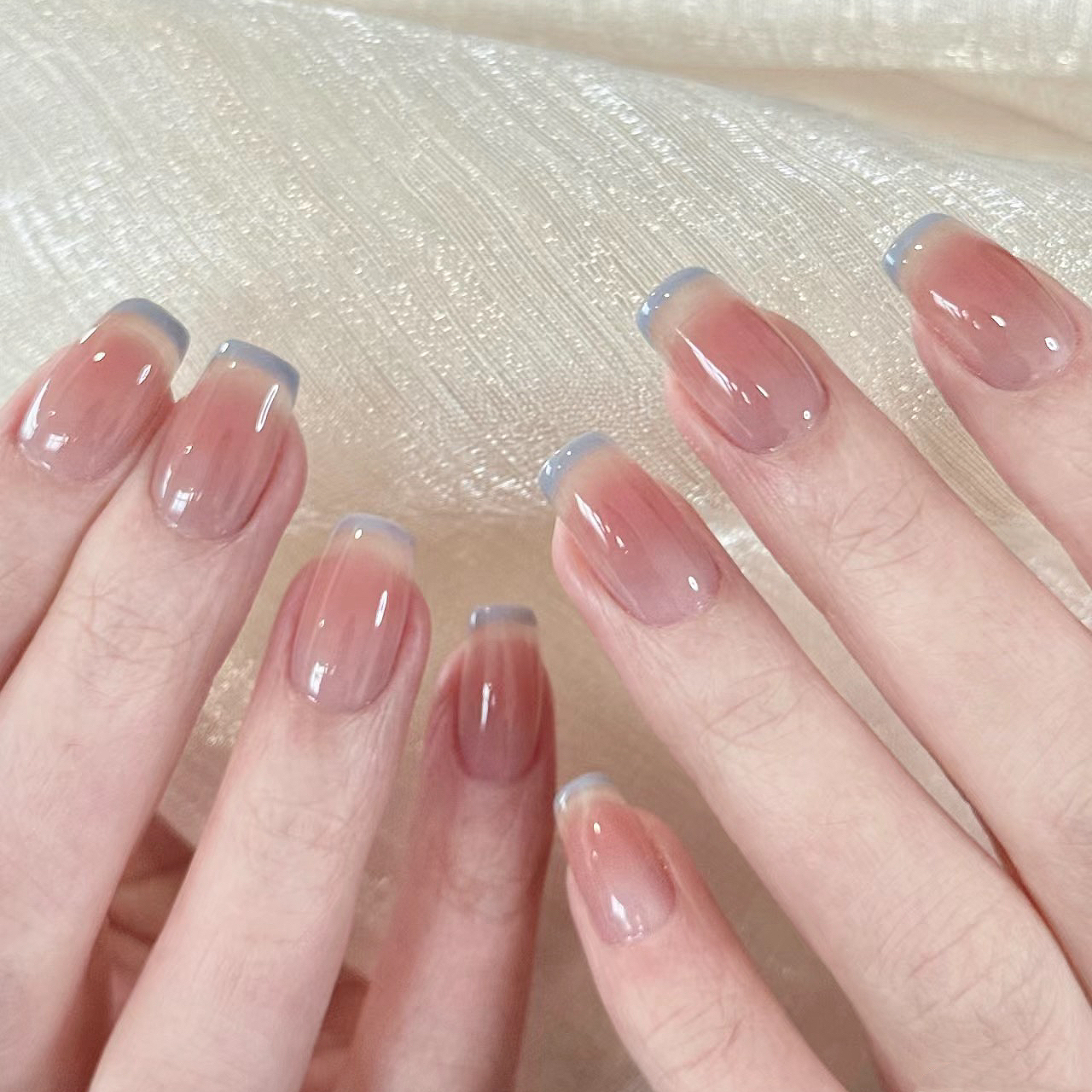 藍色腮紅法式霧霾藍顯白穿戴甲成品美甲甲片假指甲可拆卸高級手工