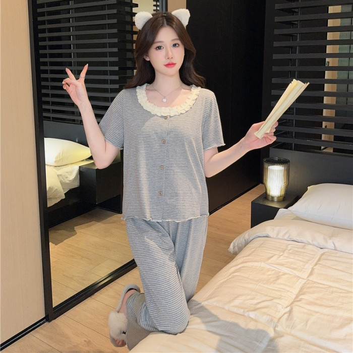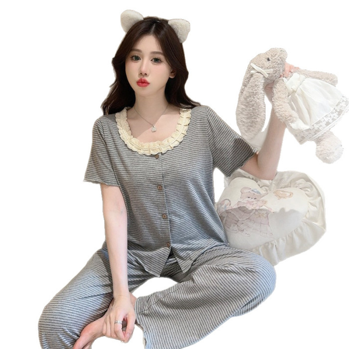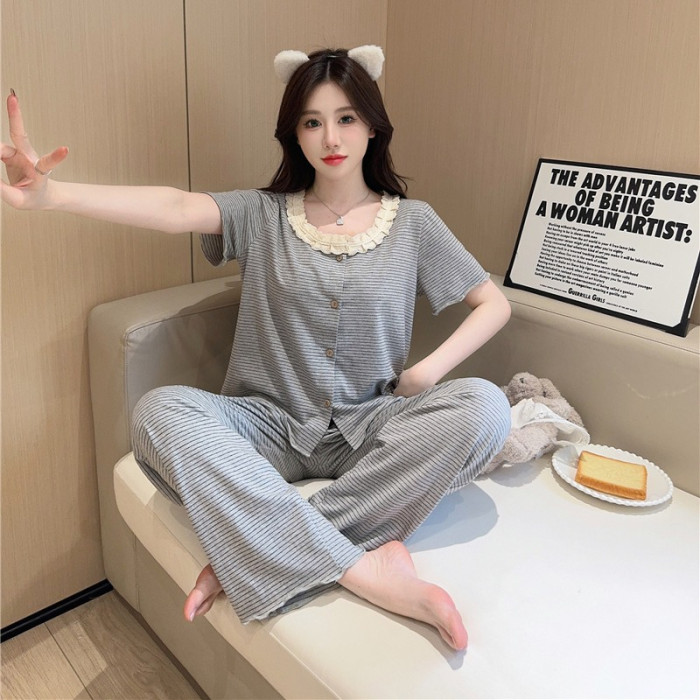 睡衣女夏秋莫代爾棉條紋寬松舒適可外穿短袖長褲套裝加胸棉家居服