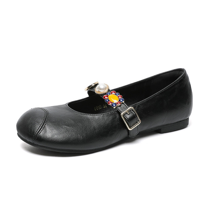 法式復古軟皮低跟單鞋女2025新款圓頭淺口搭釦一腳蹬奶奶鞋女
