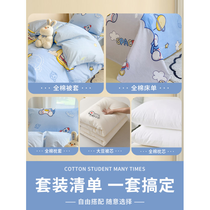 0.9m床五件套【被套*1+A版床單*1+枕套*1+枕芯*1+ZJ原棉大豆被芯*1】