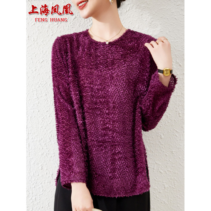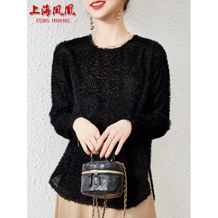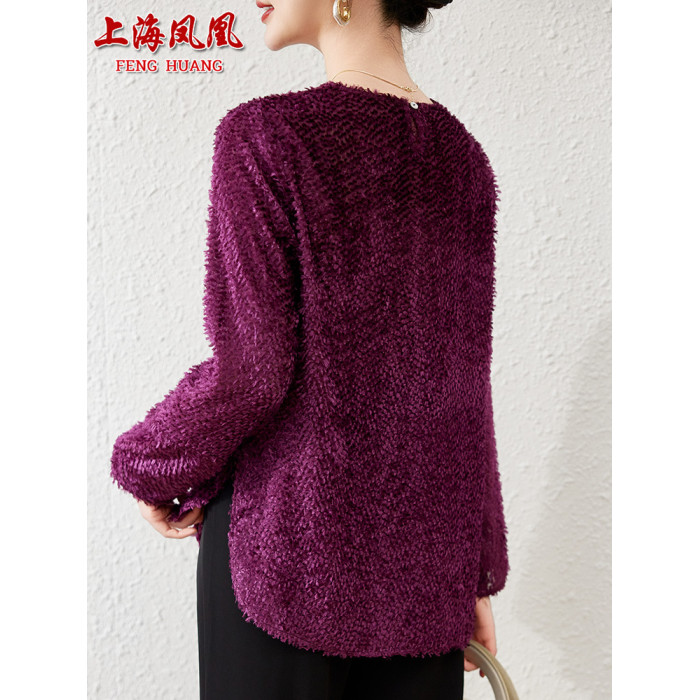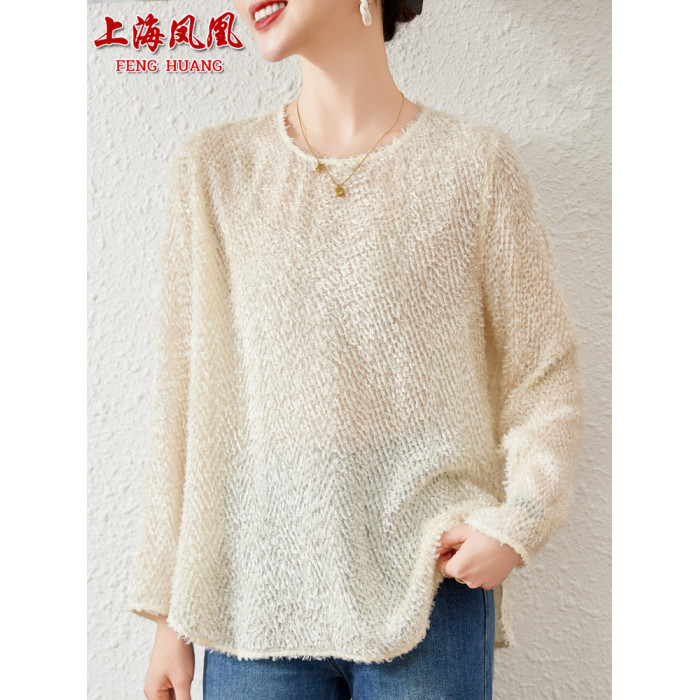 上海鳳凰真絲流蘇羽毛感長袖上衣女2025圓領打底衫溫柔長袖桑蠶絲
