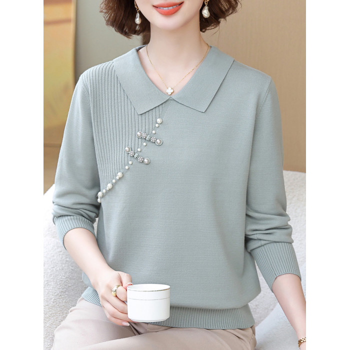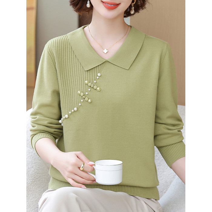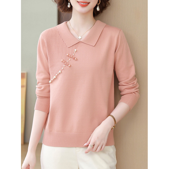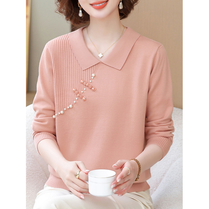 2025新款媽媽春裝時尚針織上衣中老年女時尚翻領小衫春秋打底衫