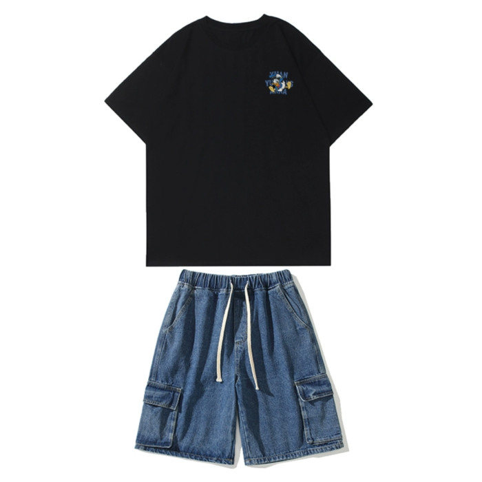 黑色側面史迪仔印花T恤+牛仔短褲套裝