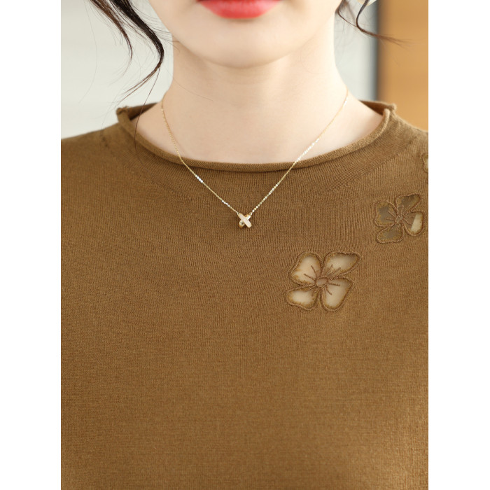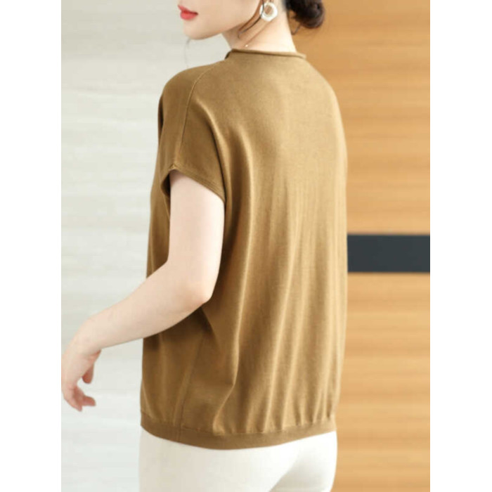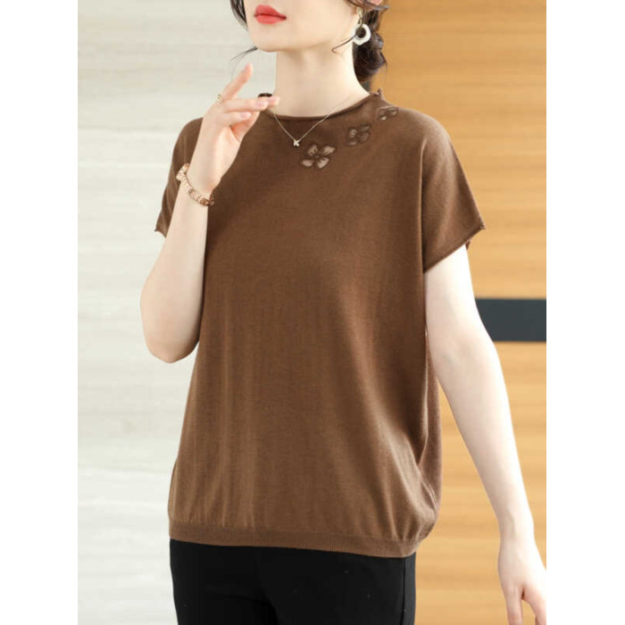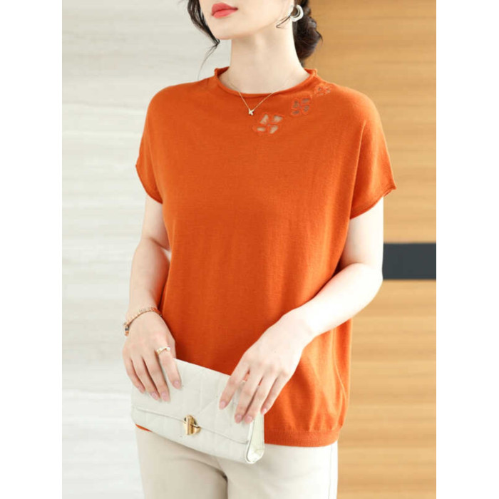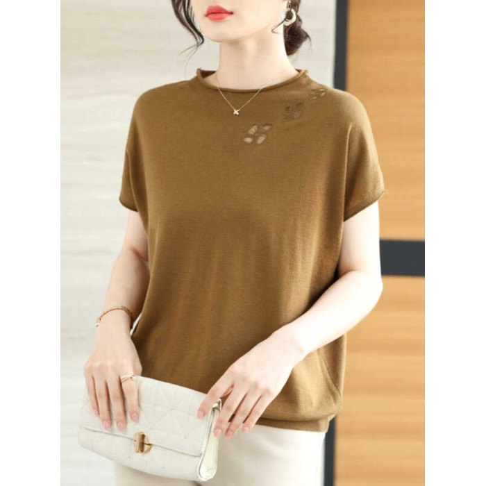 2024超細羊毛圓領卷邊針織打底衫女百搭純色短袖鏤空上衣薄款歐貨