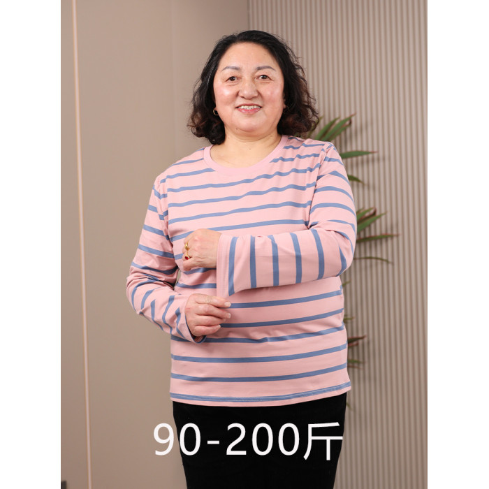 老年人外穿大碼條紋上衣長袖200斤寬松中老年媽媽打底衫內搭純棉