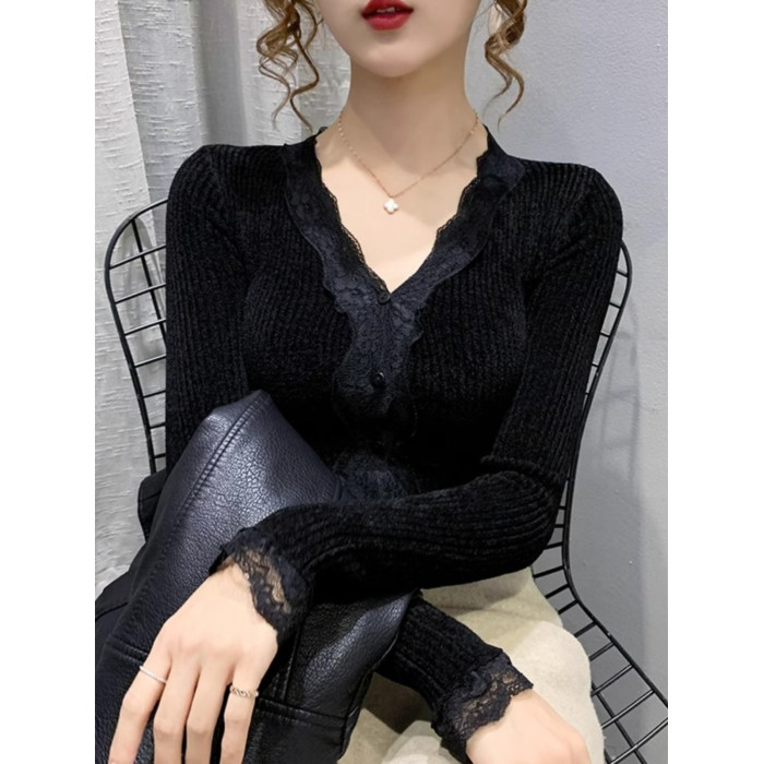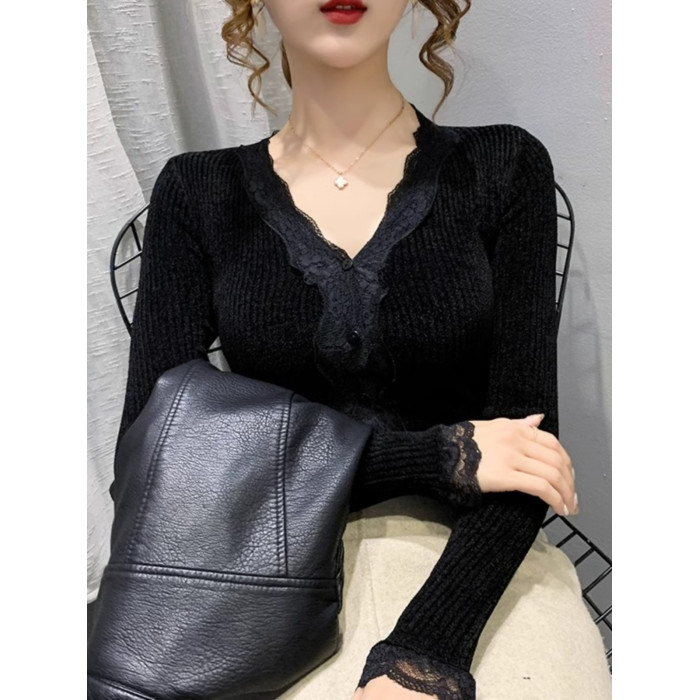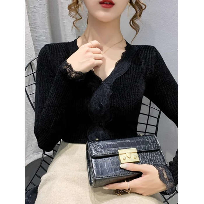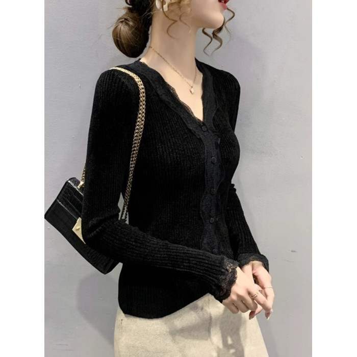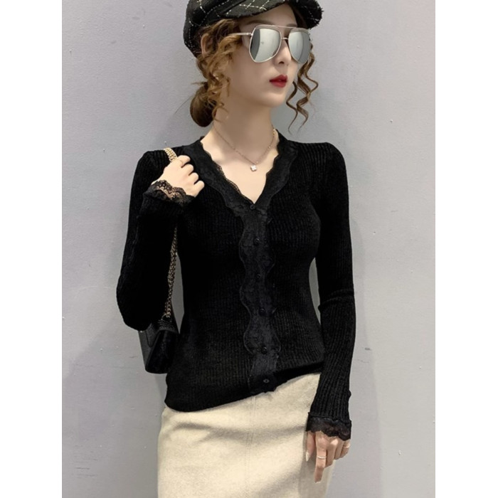 天鵞絨蕾絲花邊V領打底衫女春秋新款黑色毛衣洋氣修身針織衫上衣
