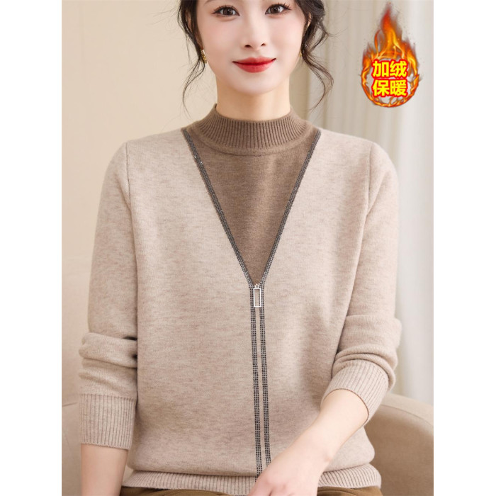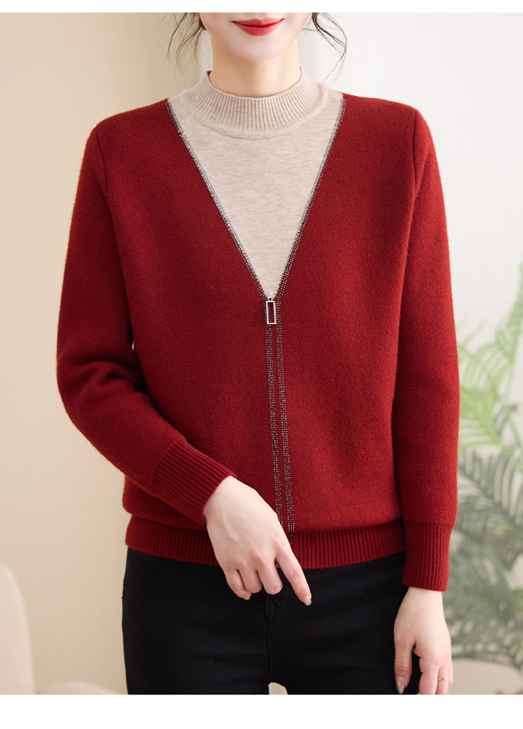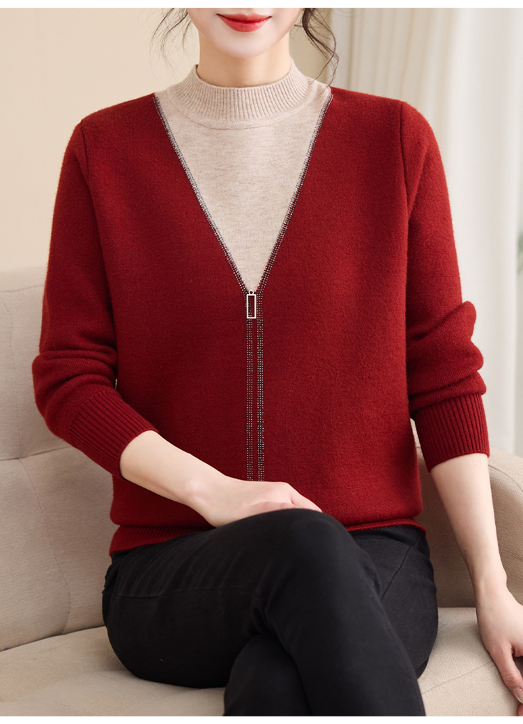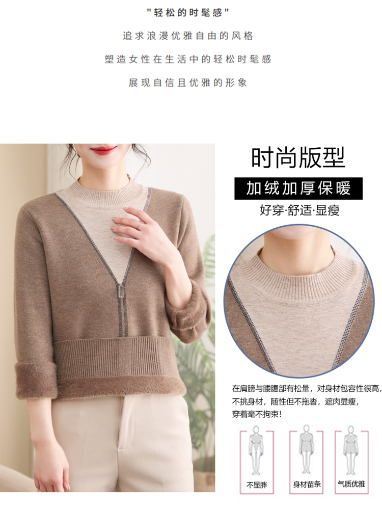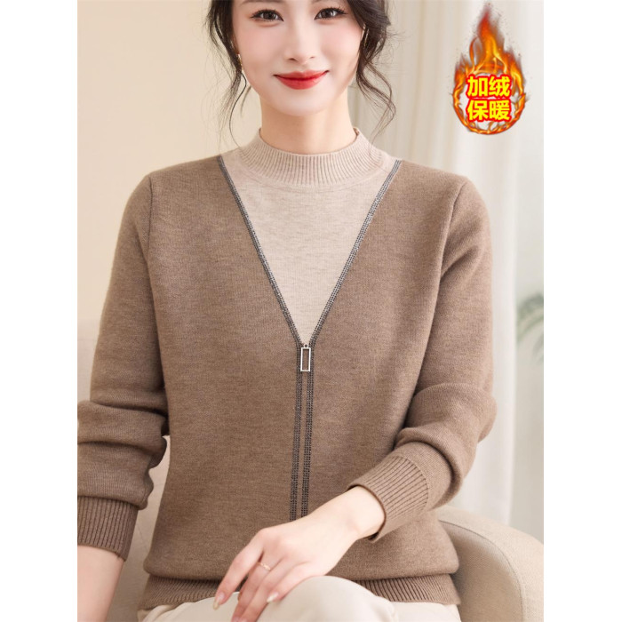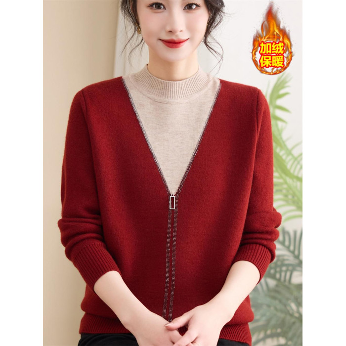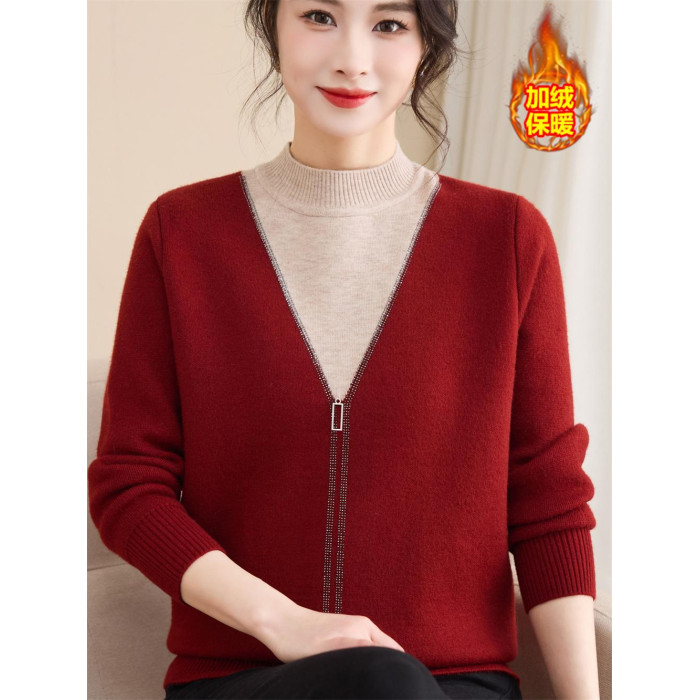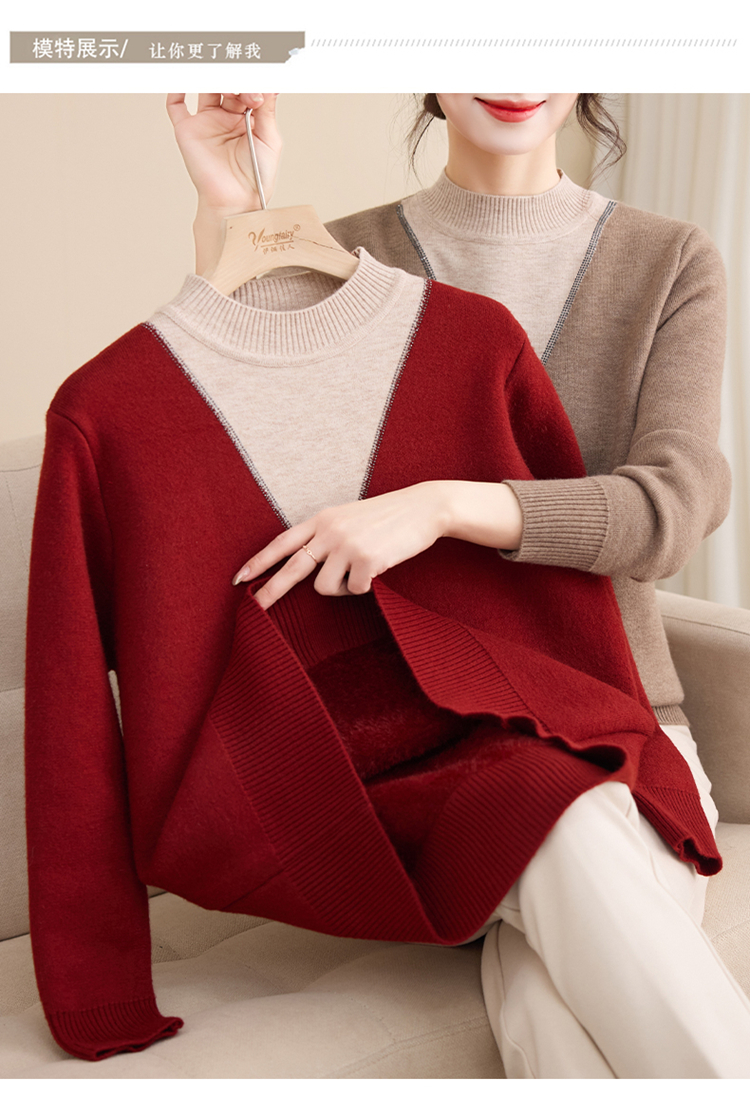本命年媽媽冬裝假兩件紅色毛衣一體絨針織打底衫新款加絨加厚上衣