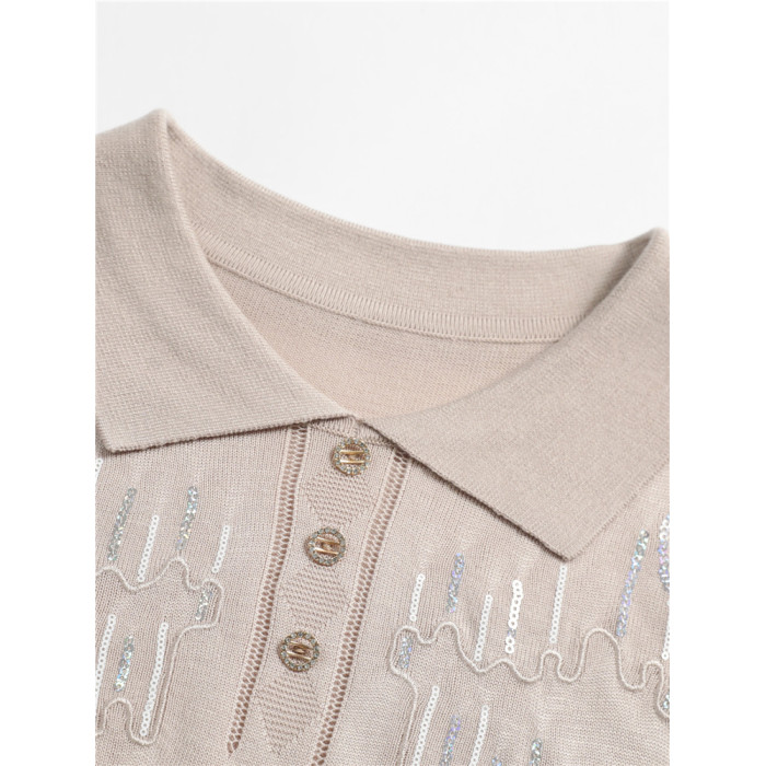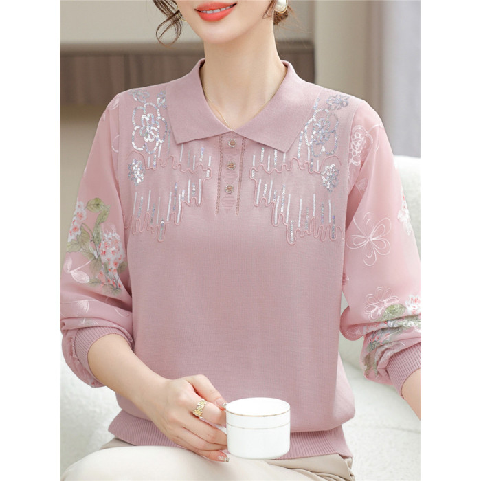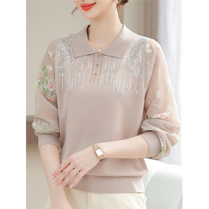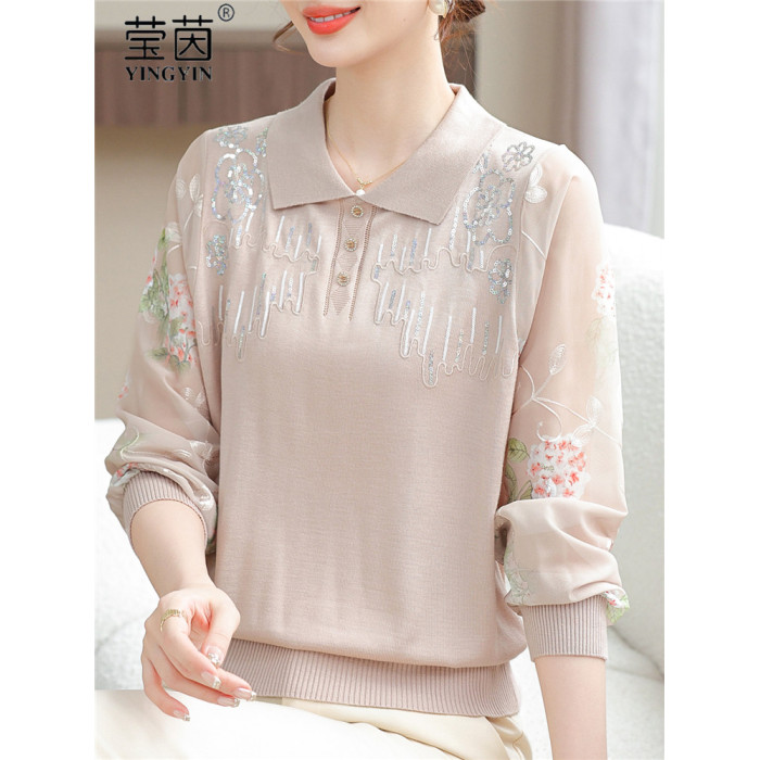 媽媽秋裝洋氣紗袖薄針織小衫中老人女時尚翻領長袖打底衫氣質上衣