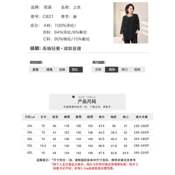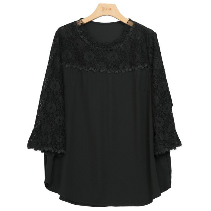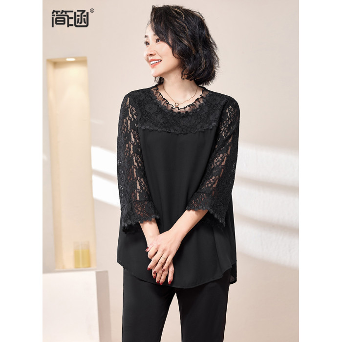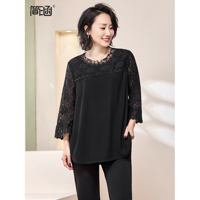簡涵大碼女裝高級輕奢上衣春季新款寬松遮肚百搭打底衫蕾絲雪紡衫