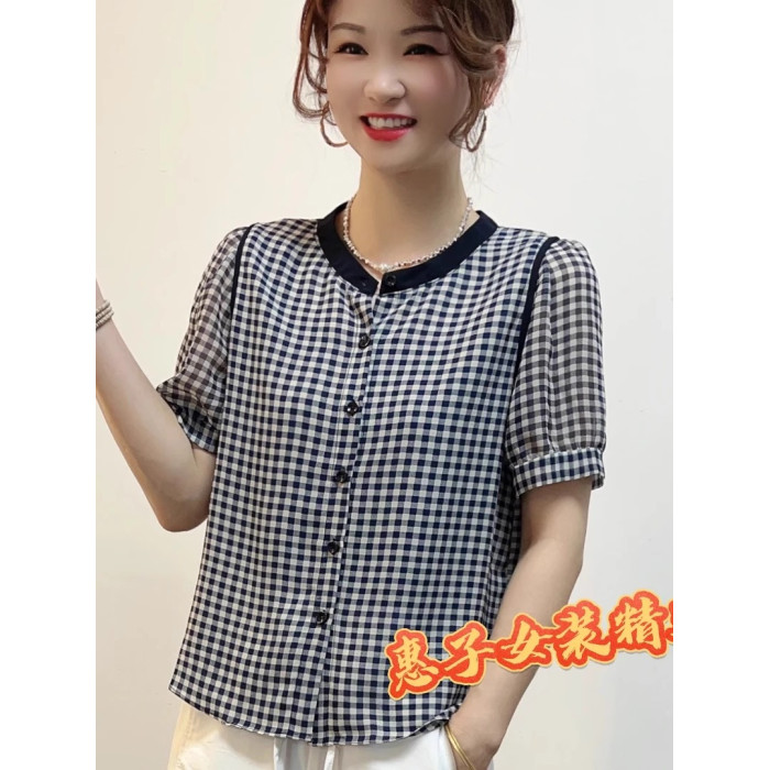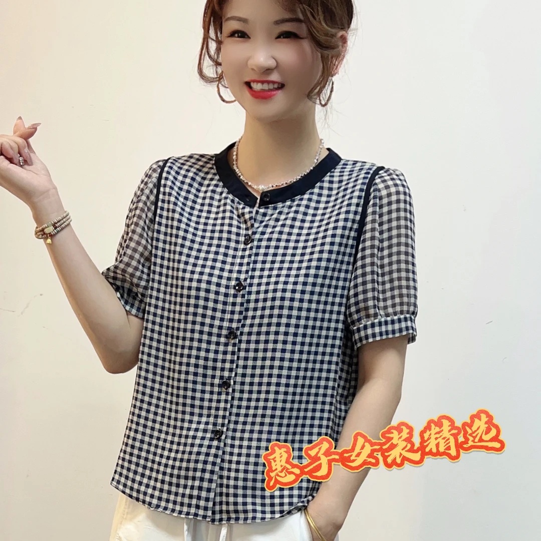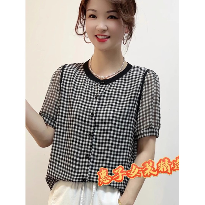 2025夏季新款韓系圓領格子短袖襯衫T恤時尚百搭拼色小衫顯瘦上衣
