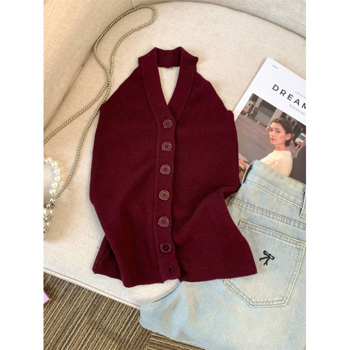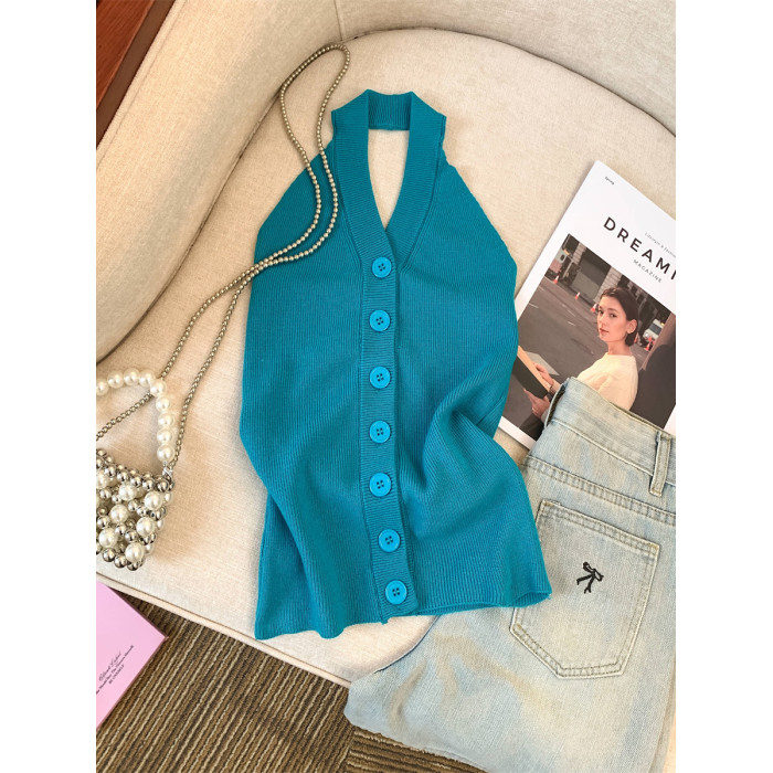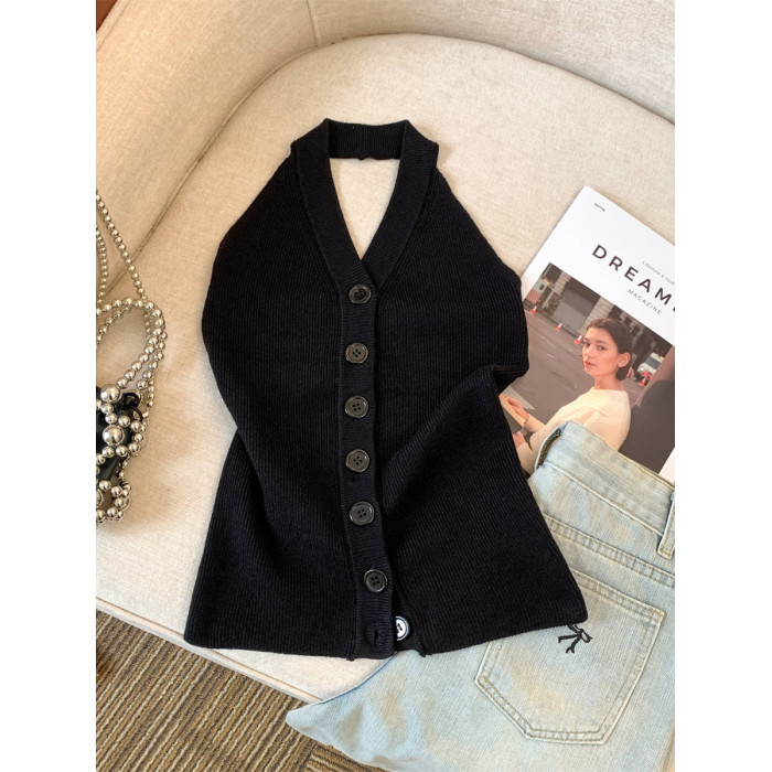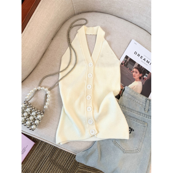 夏季薄款冰絲無袖上衣女掛脖露背打底衫法式小心機背心針織小開衫