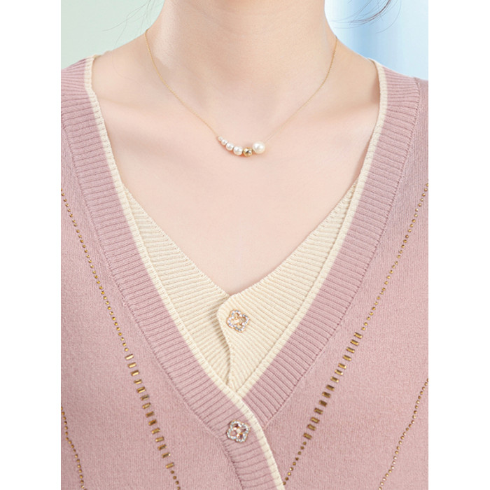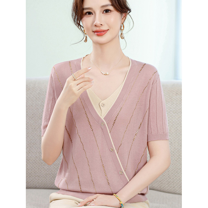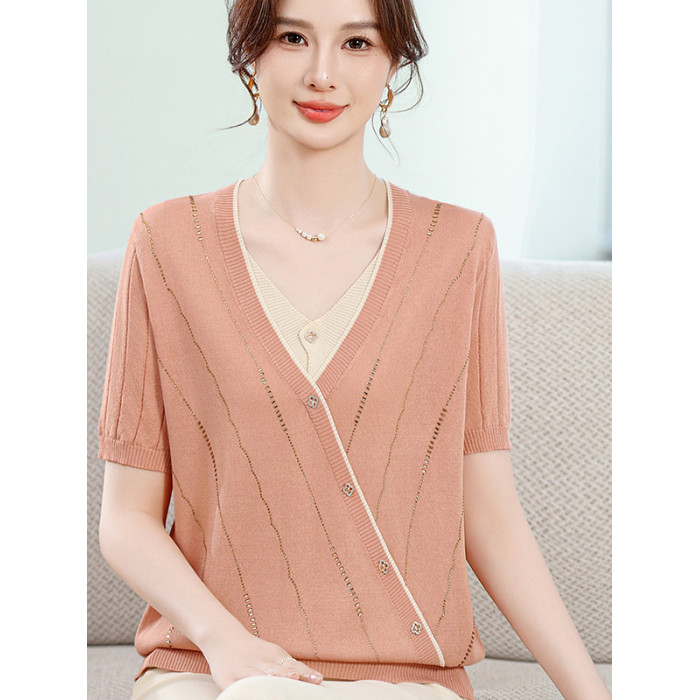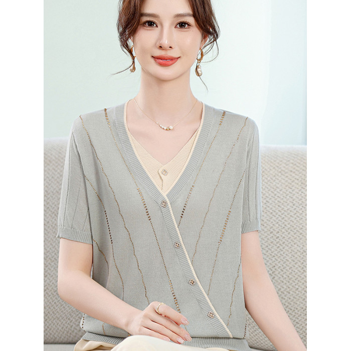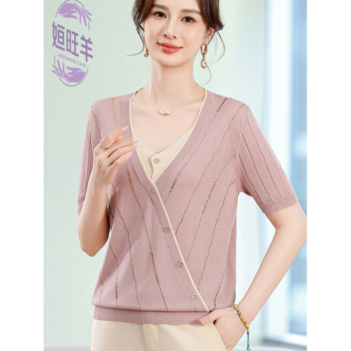 媽媽夏裝新款針織休閒V領打底衫時尚中老年2025年夏季短袖冰絲衫