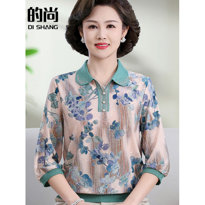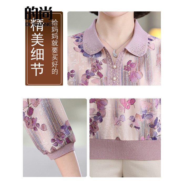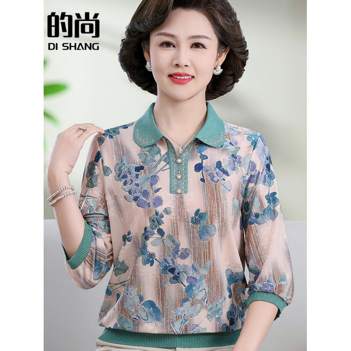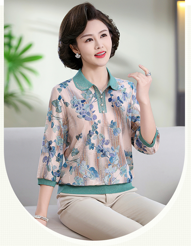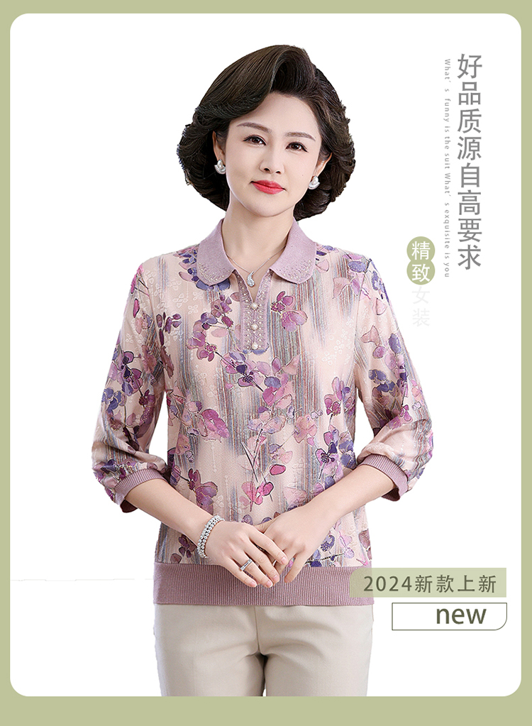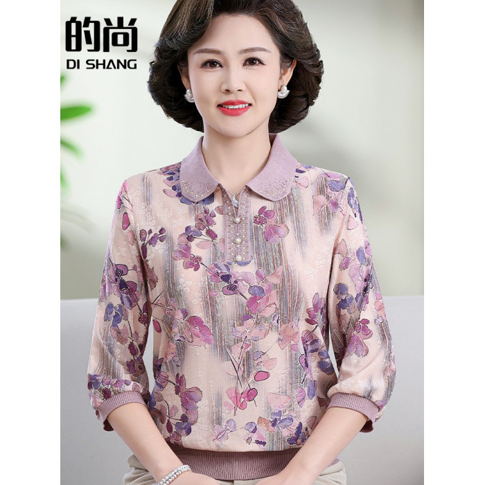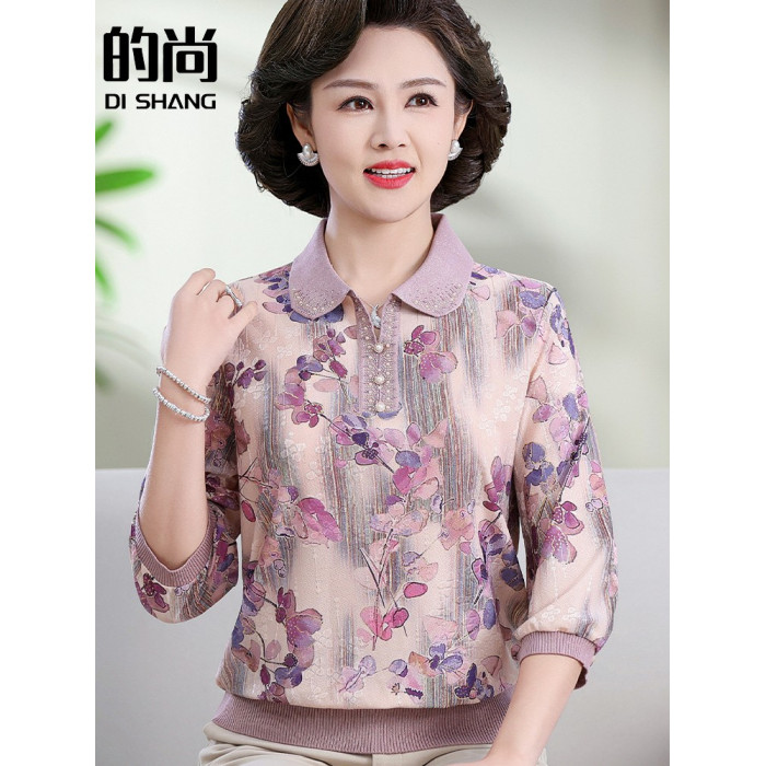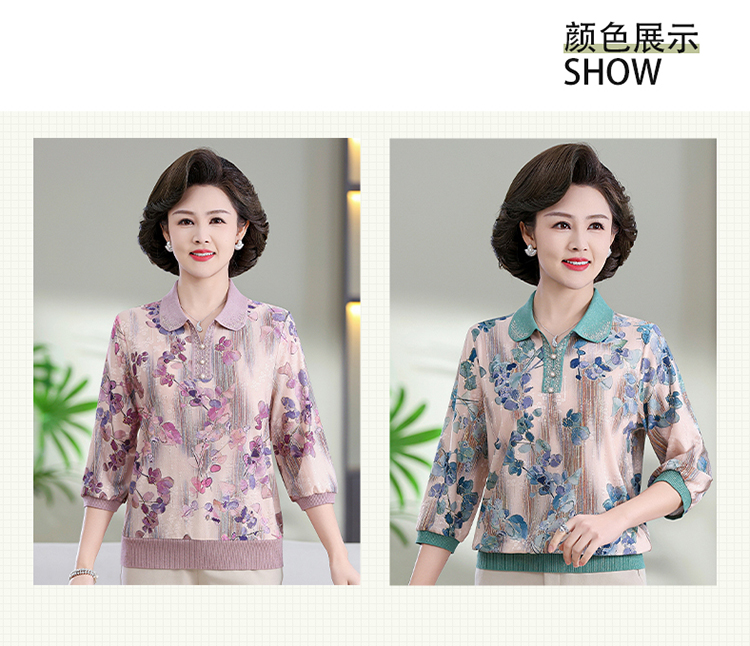 中老年媽媽裝翻領針織衫洋氣花色薄款打底衫春秋奶奶裝套頭小衫女
