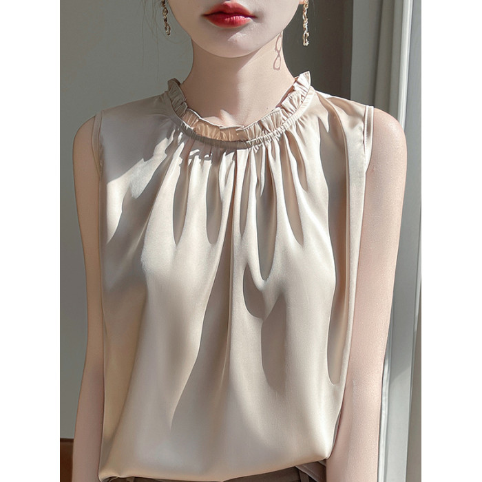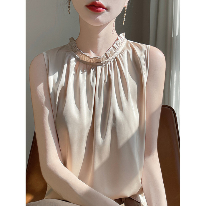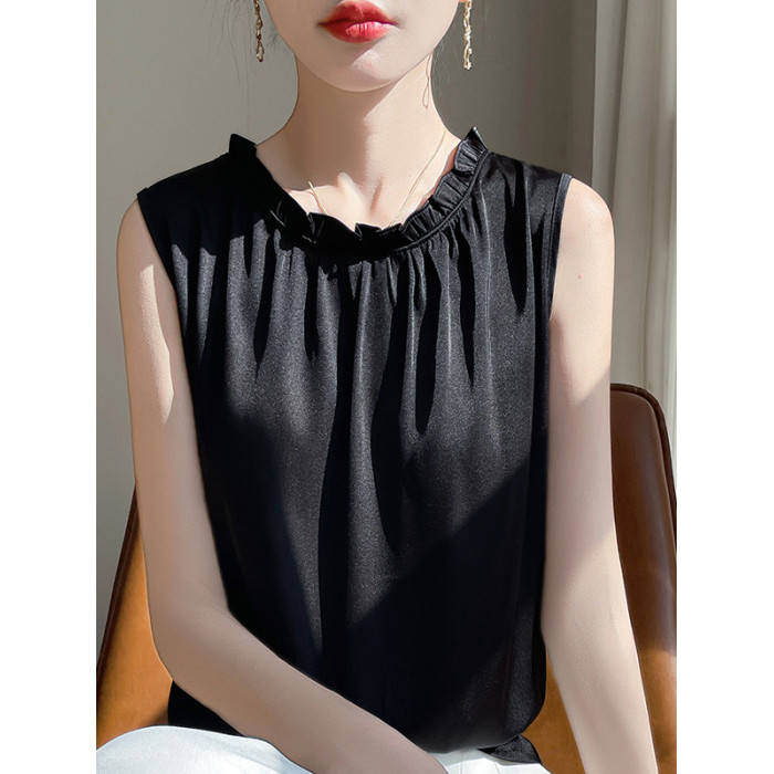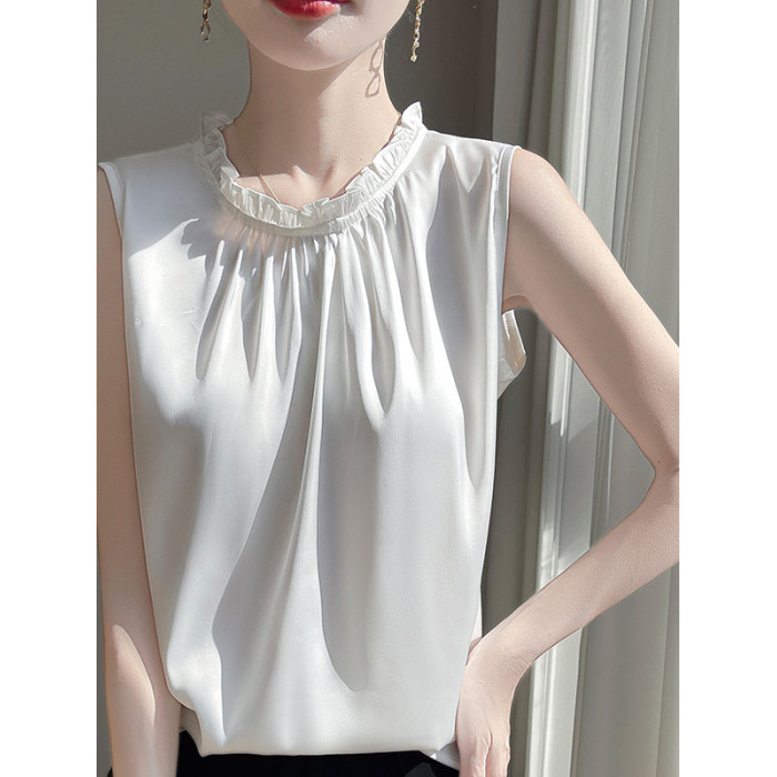 夏季新款高級感法式無袖背心女寬松內搭花邊荷葉領木耳邊打底衫
