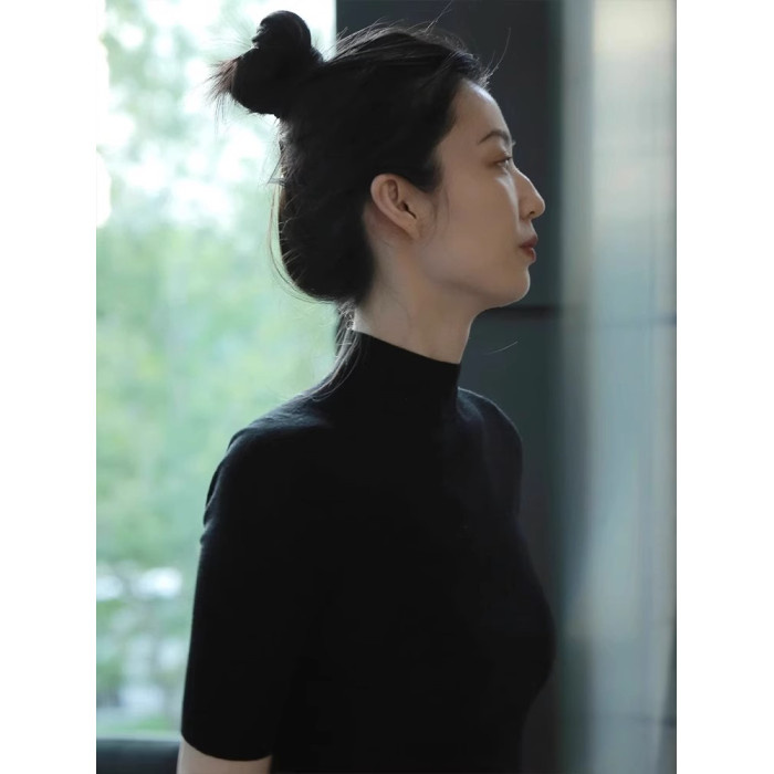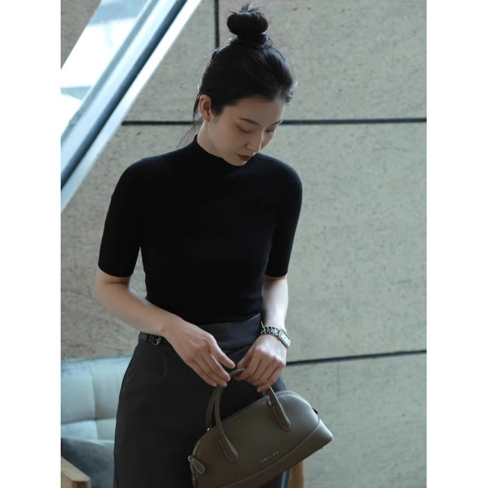 BEBE NOBLE法式半高領短袖打底衫女春秋高級修身中袖正肩內搭上衣