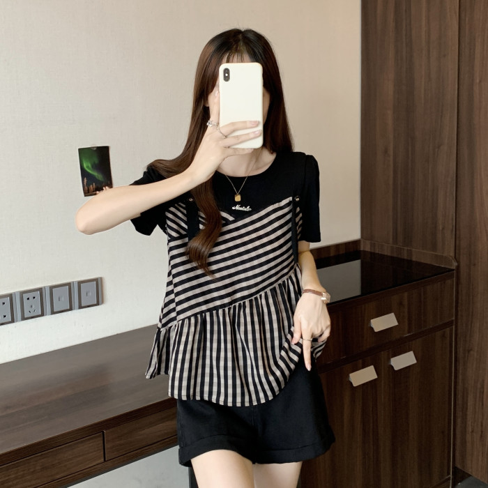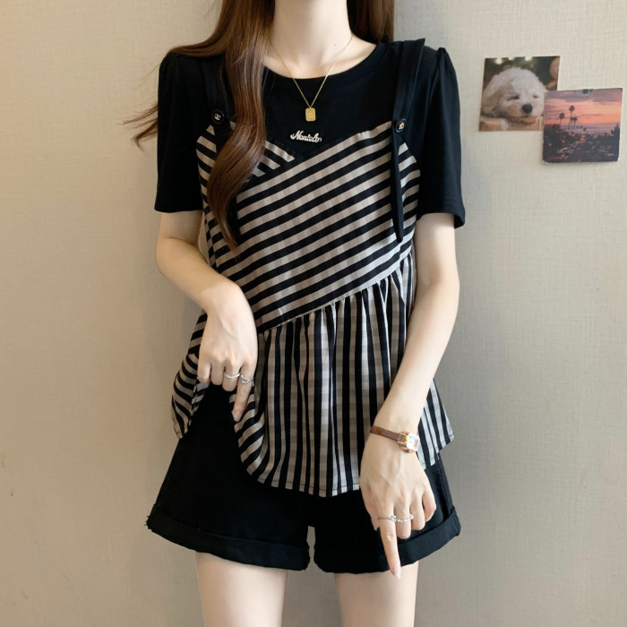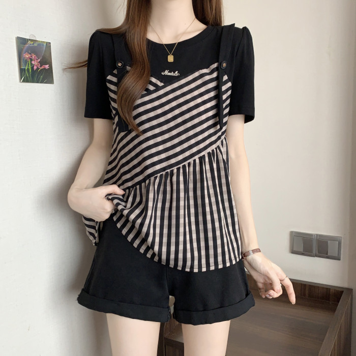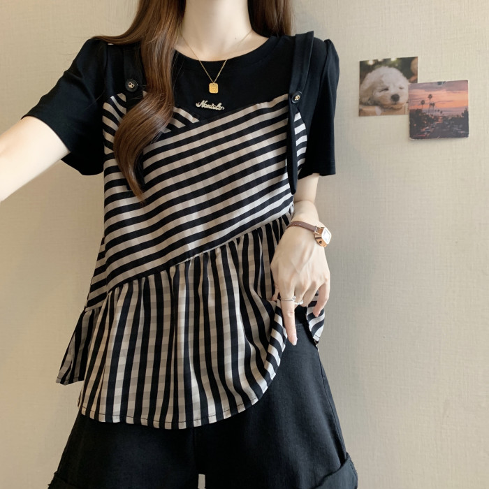 大碼女裝遮肚子假兩件插肩條紋打底衫夏季胖妹妹時尚百搭遮肉上衣